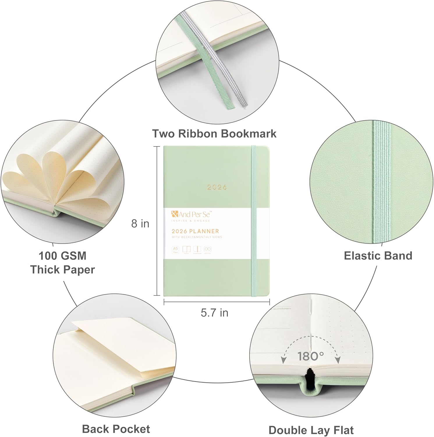 And Per Se 2026 Planner-Daily, Weekly & Monthly Leather Hardcover Planner, 5.7" x 8", Daily Schedule, Monthly Tabs, 100 GSM Thick Paper, Back Pocket(Mint)