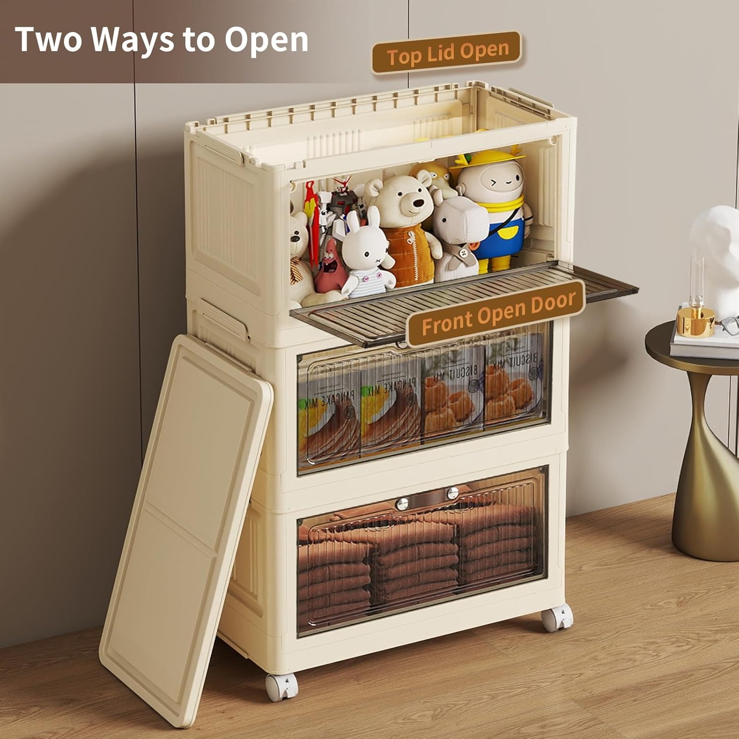 - Two Opening Ways: There are two ways to open the lid storage box. You can open the top cover or open it from the front door. The front cover of each plastic drawer storage is translucent, and you can clearly see the items stored inside, which is a good assistant to our family