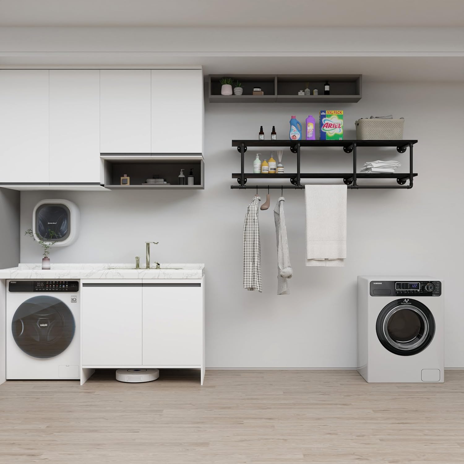 Wall Mounted Clothes Rack 12 Inch Deep, 60 Inch Heavy Duty Garment Rack with Real Black Wood Shelf, Multi-Purpose Hanging Rod & Space-Saving Closet Storage Organizer