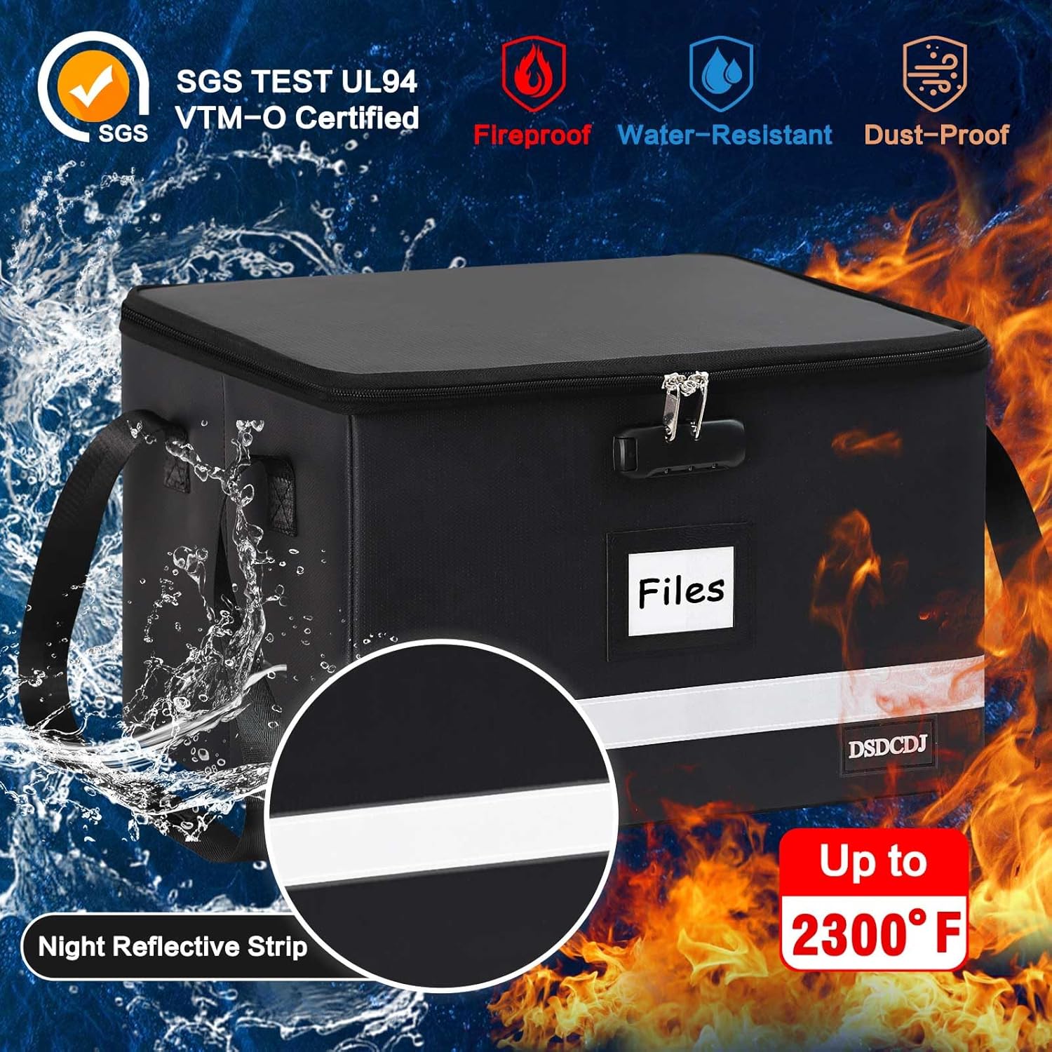 - 【FIREPROOF & WATER-RESISTANT】The upgraded fireproof file box is made of 3 layered non-itchy silicone coated fiberglass which stands up the temperature up to 2300℉. It has been passed by SGS TEST(UL94 VTM-0 Certified). The fireproof document box is fireproof&Water-resistant, which can effectively protect your important documents in a fire, flood, and wet weather. The product is USPTO Patent Approved