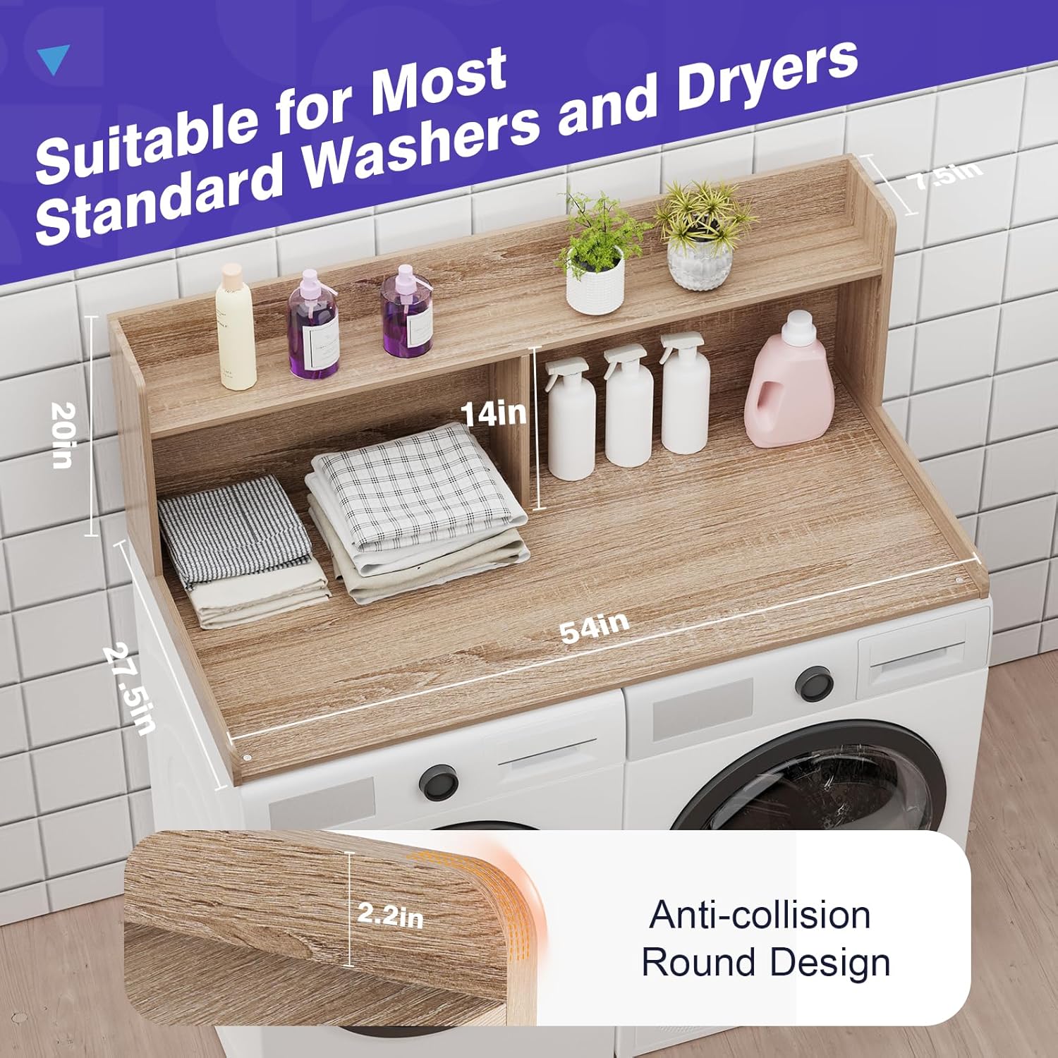 - Functional: The wood laundry topper for the washer and dryer makes my small laundry room more workable, transforms your laundry room, and makes the laundry room feel like a brand new room, tidy and clean. Comes with anti-slip pads, prevents any vibration or movement when the machines are running, and also protects the top from getting scratched
