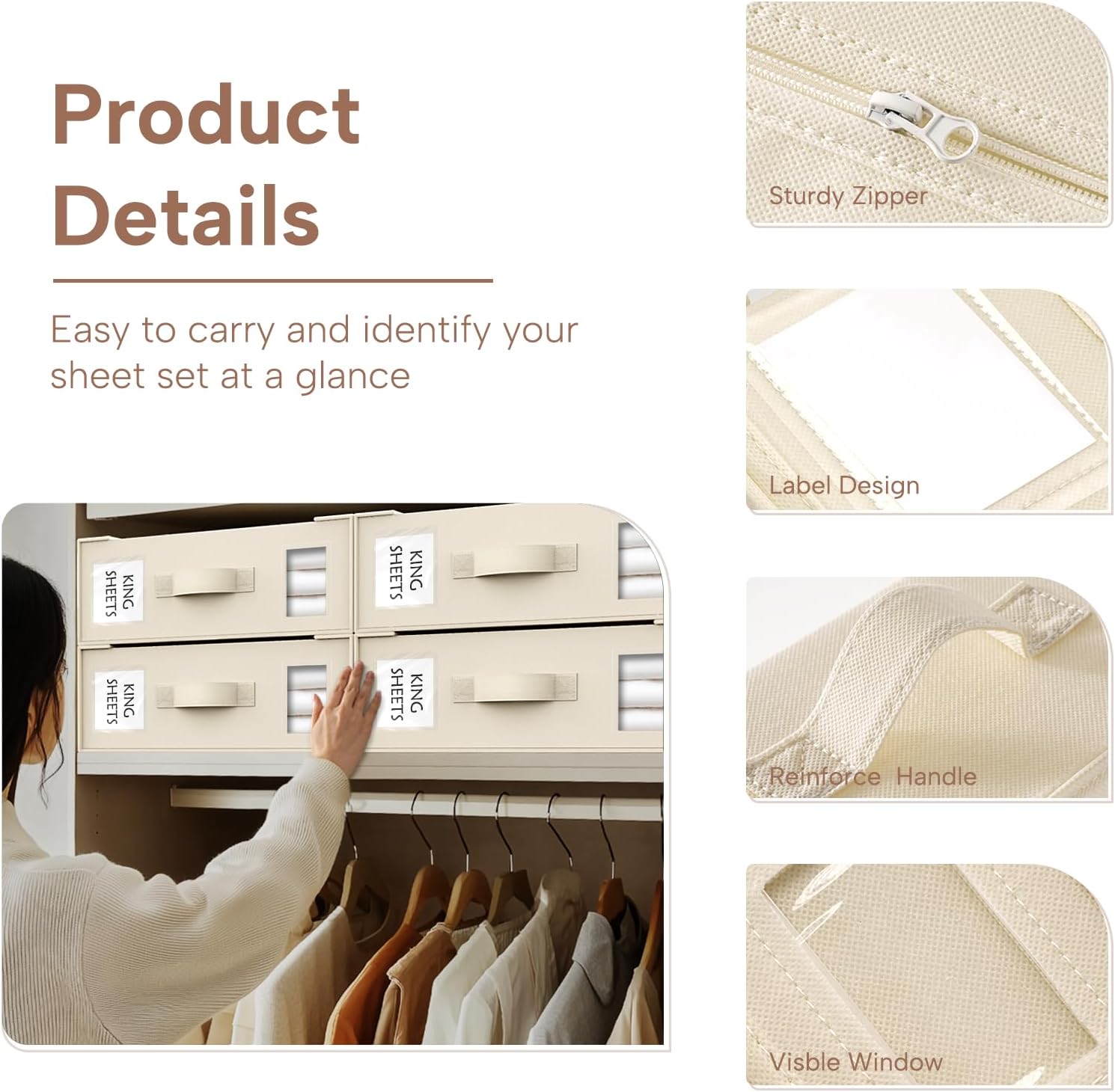 Criusia Bed Sheet Organizers and Storage, 4 Pack Foldable Linen Closet Organizers – Bedding Holder for Sheet Set (King/Queen Sizes), Duvet Covers, Blankets (Beige)