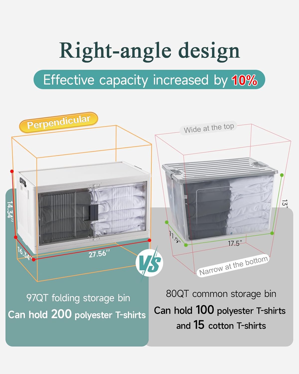 - Large Capacity: With dimensions of 27.56 inches (L) x 14.76 inches (W) x 16.34 inches (H) (2.17 inches when folded), these storage bins offer a spacious capacity of up to 97 quarts (24.25 gallons). They comfortably hold everyday items like cleaning supplies, snacks, office materials, and seasonal decorations. Their robust construction can support weights of up to 400 pounds (180KG), of weight, making them suitable for heavier items like books and tools