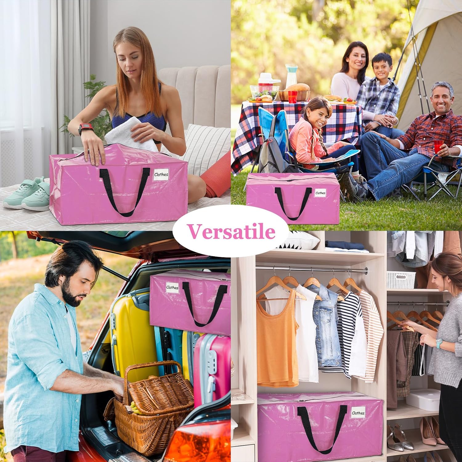 4 Pcs 24 Gallon Large Moving Bags with Zipper and Handles Foldable Storage Duffle Bags Heavy Duty Extra Large Totes for College Dorm Travel Clothes Blankets Bedding Moving (Pink)