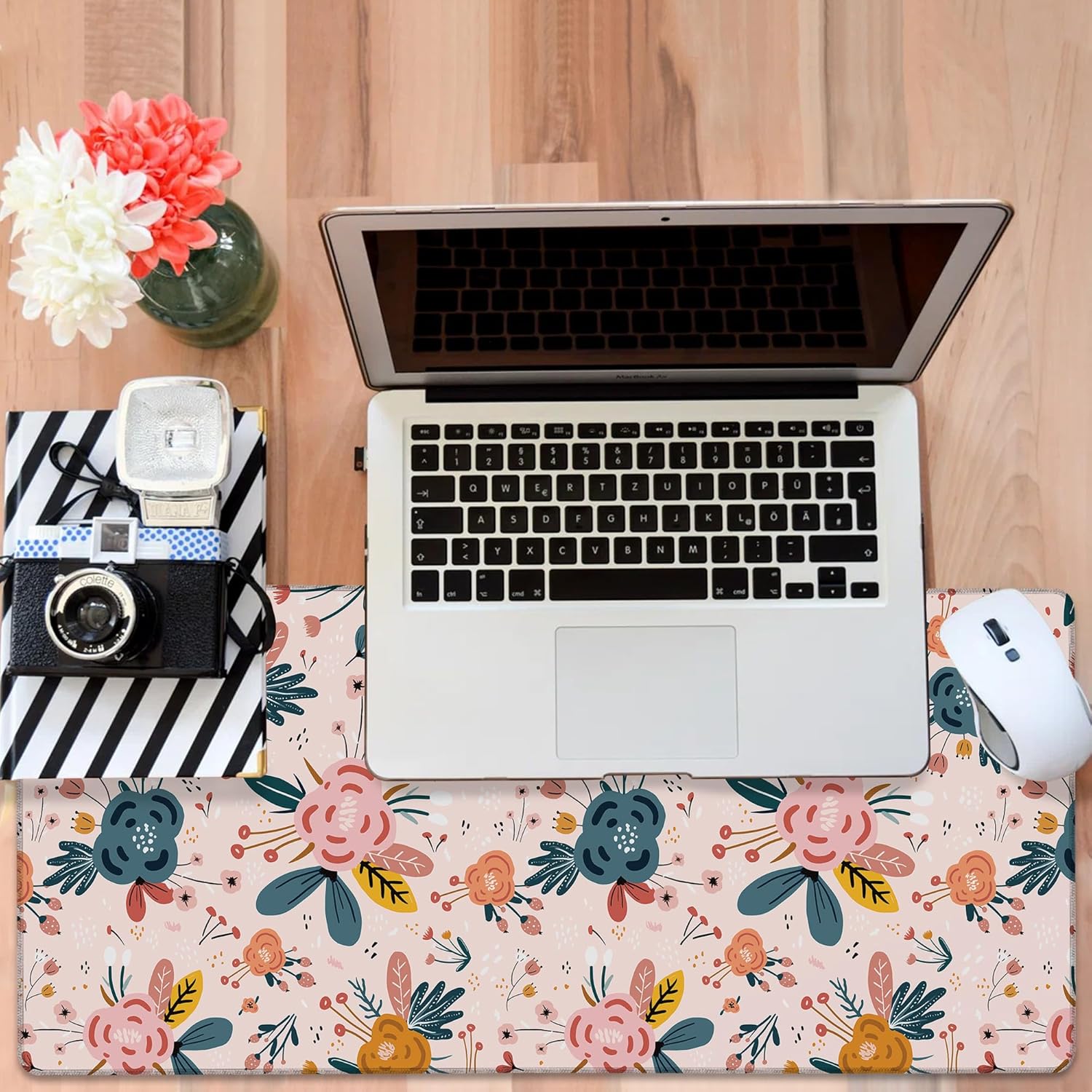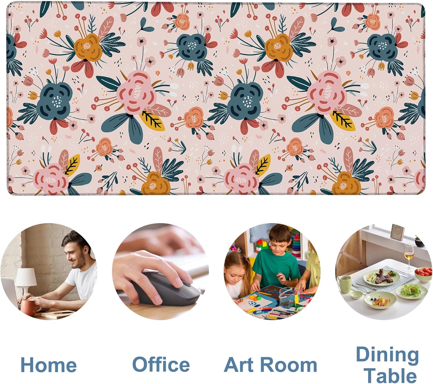 Gaming Desk Pad Large Extra Length Hand Drawn Floral Mouse Pad Keyboard Laptop Non-Slip Waterproof with Rubber Base Thick Stitched Edge Mouse Mat for Office Home 35.4 x 15.7 Inches