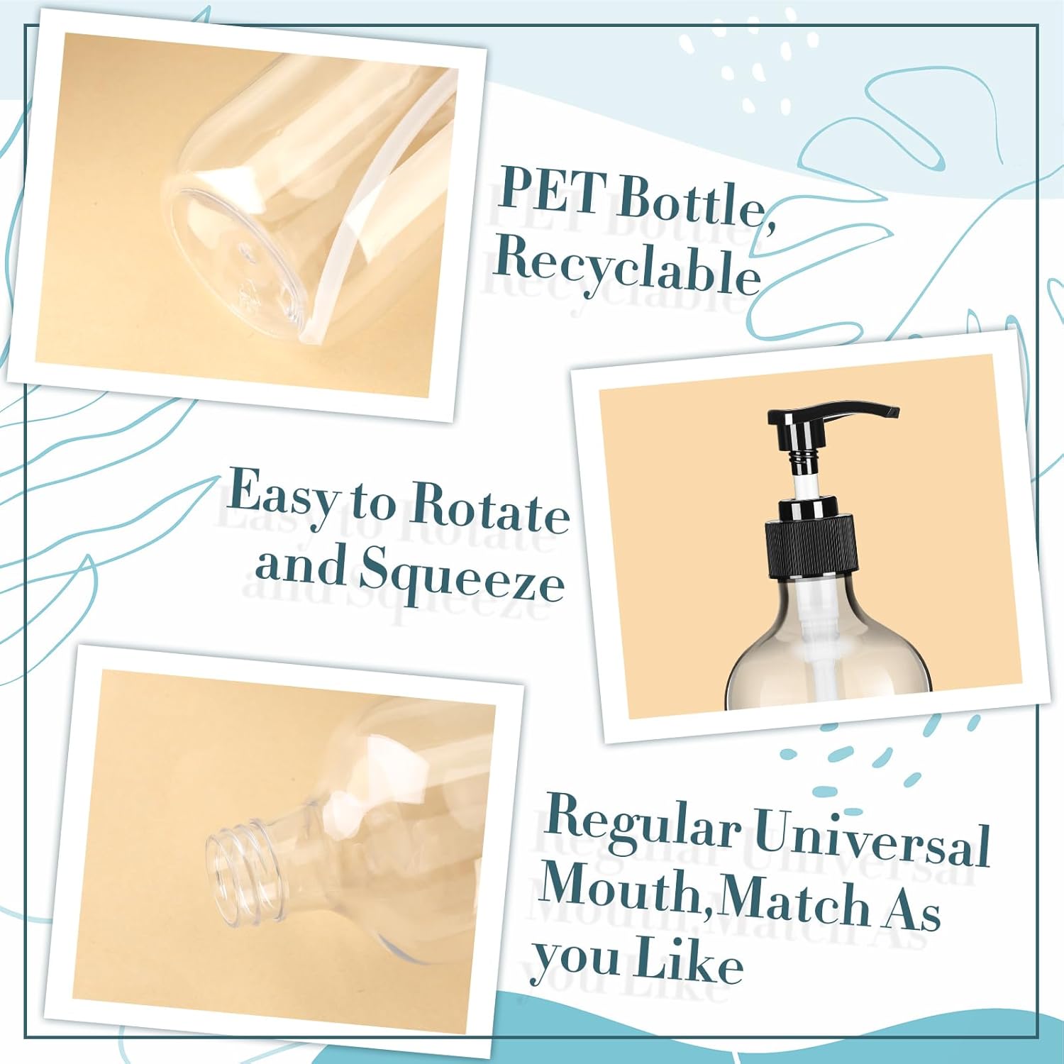 - Multifunctional and Versatile: the pump bottle dispenser can be applied on the countertop of kitchen, bathroom, hotel, classroom and many other places, to contain liquid hand sanitizer, lotion, shampoo, conditioner, cream, gel, body wash, coffee syrup, cleanser essence and so on, practical and convenient