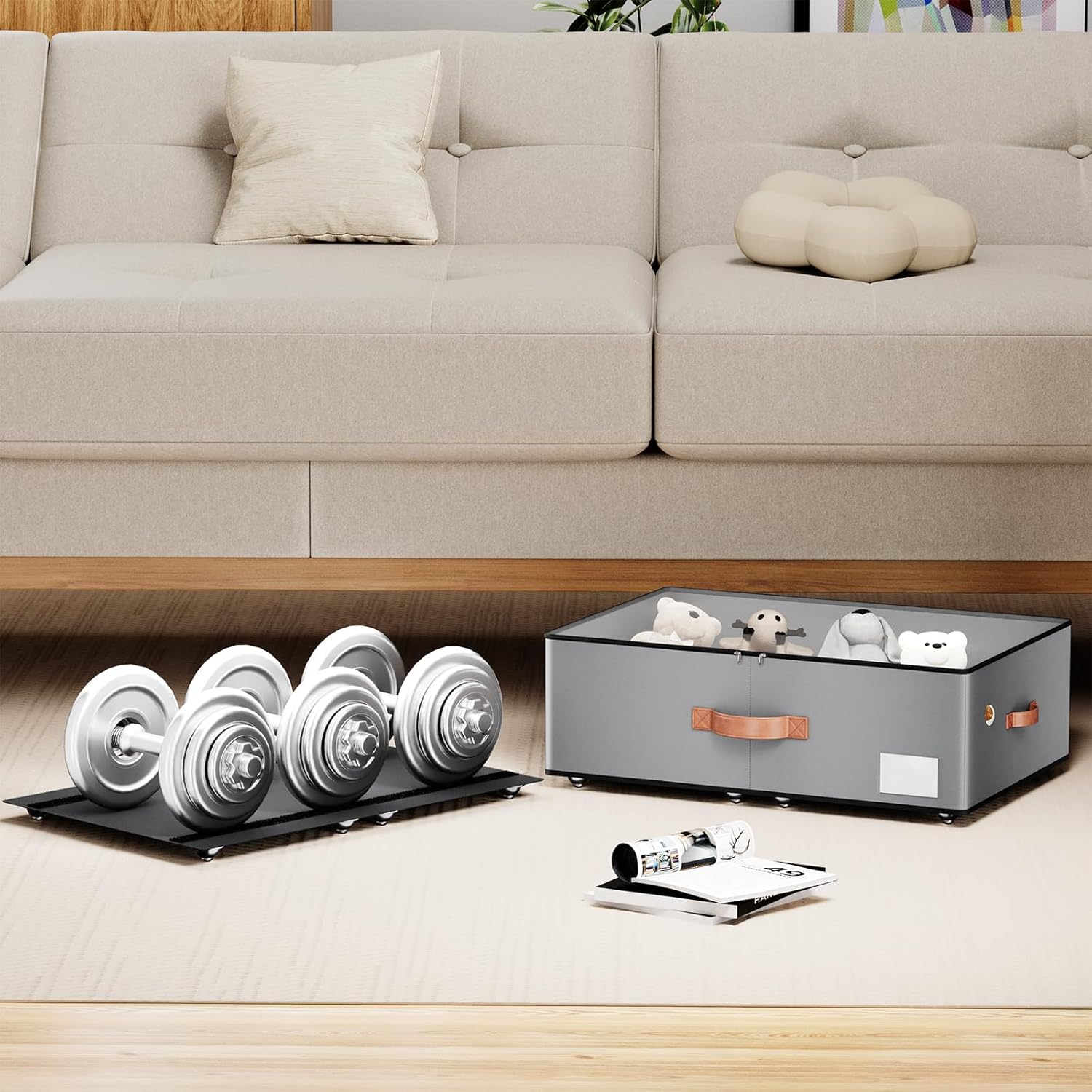 - [Multifunctional Storage Solution]: Our underbed storage box offers versatility for various storage needs. Secured with Velcro, the bottom frame and storage box can be utilized in different places, including closets, cloakrooms, bedrooms, baby rooms, under cribs, and dorms. It's perfect for storing seasonal clothes and everyday items. When not in use, simply fold them up to save space.