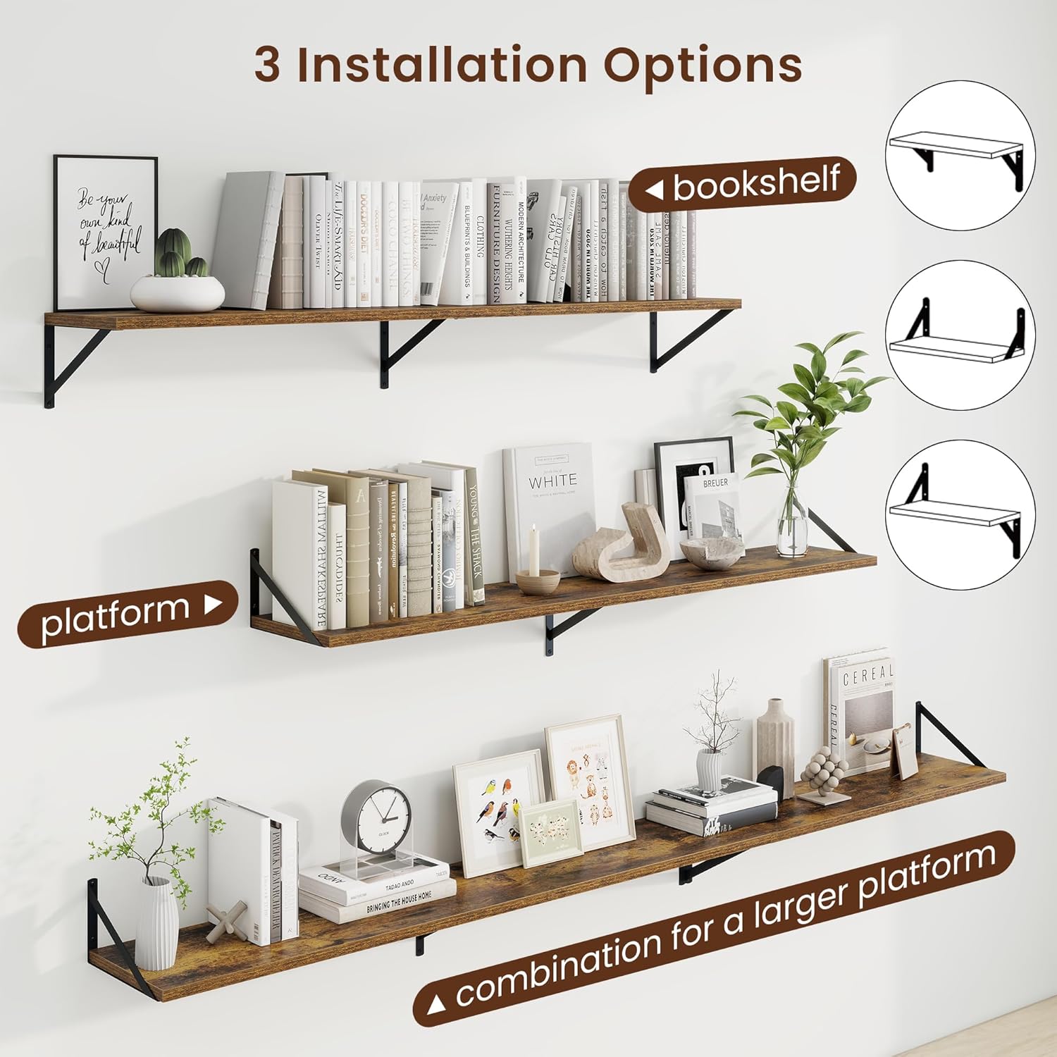 - UPGRADED MATERIAL & BRACKETS - Our wall shelves use thickened engineering wood boards paired with triangular brackets, combining aesthetics with load-bearing strength. These shelves are built to withstand the test of time, resisting deformation and breakage while providing unparalleled support for your belongings