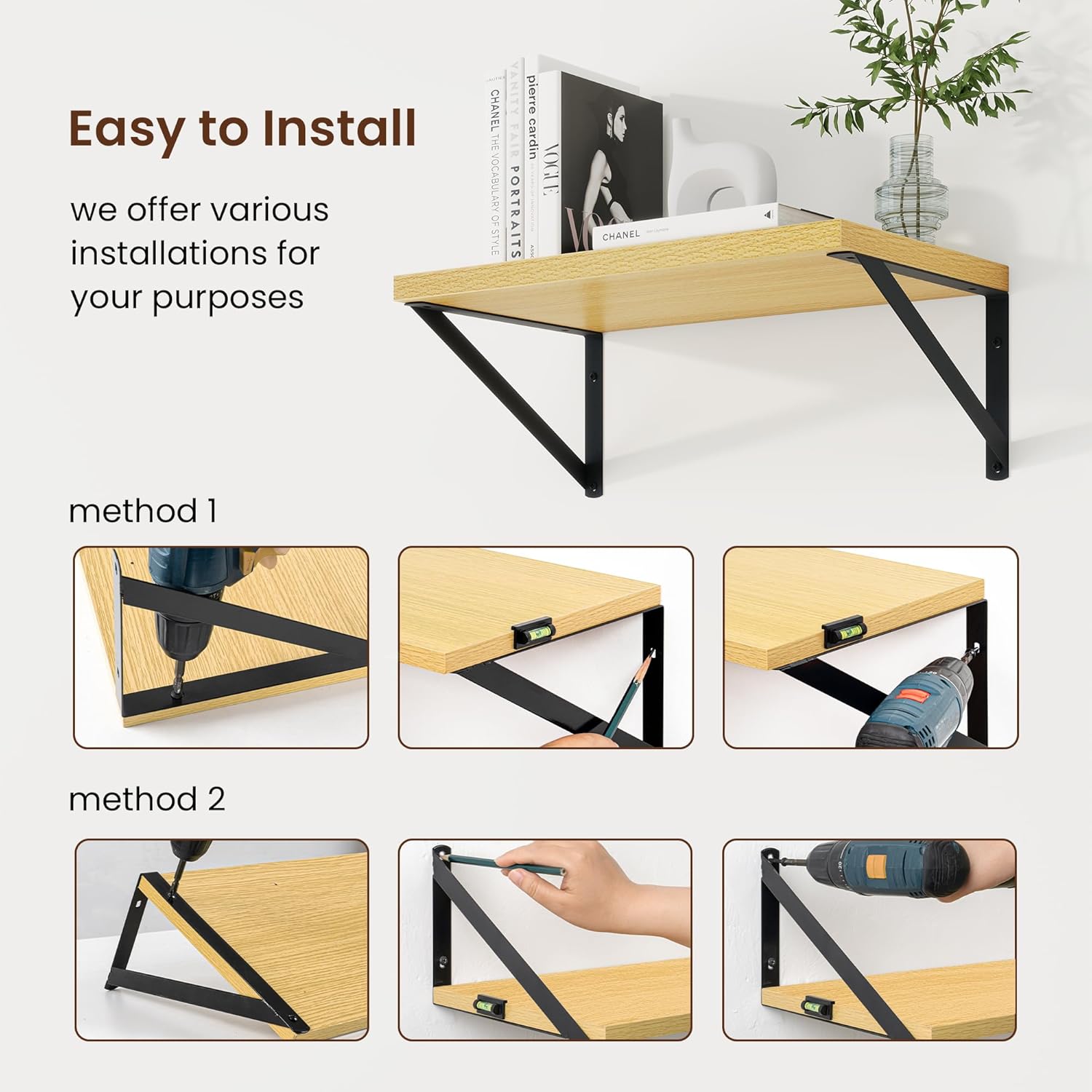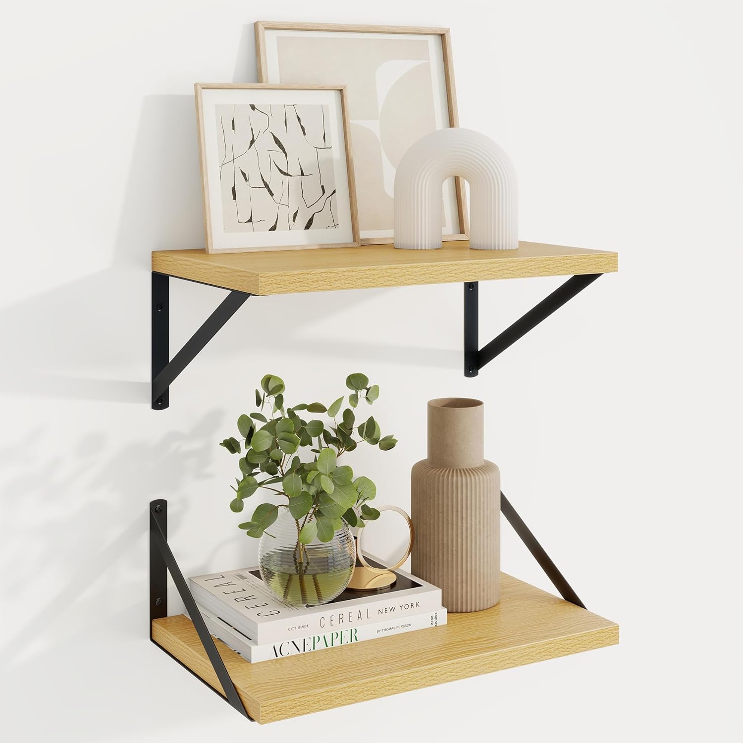 - UPGRADED MATERIAL & BRACKETS - Our wall shelves use thickened engineering wood boards paired with triangular brackets, combining aesthetics with load-bearing strength. These shelves are built to withstand the test of time, resisting deformation and breakage while providing unparalleled support for your belongings