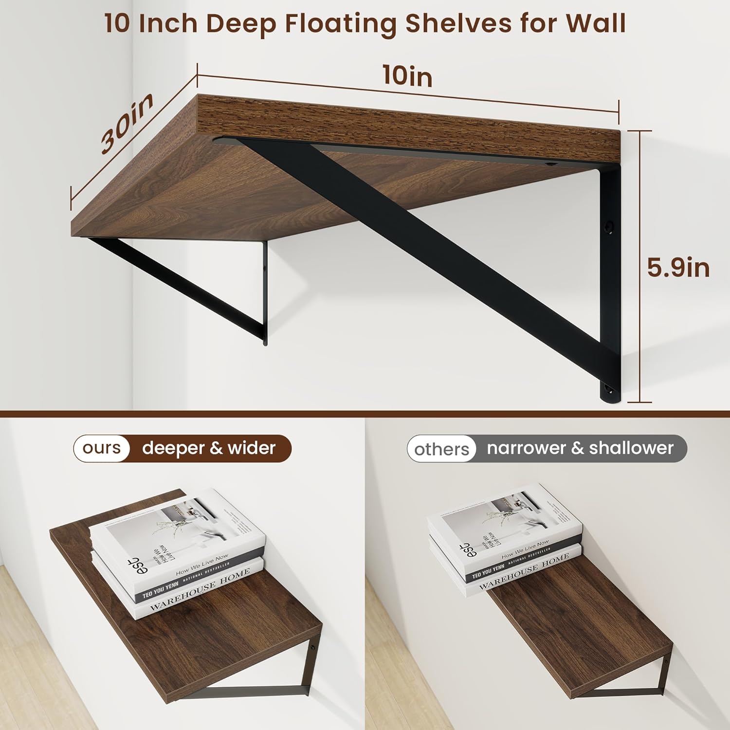 Axeman Deep Floating Shelves for Wall - 30 Inch Wide x 10 Inch Deep Floating Shelves Set of 2 -Walnut Wide Wall Shelves for Living Room Bathroom Bedroom