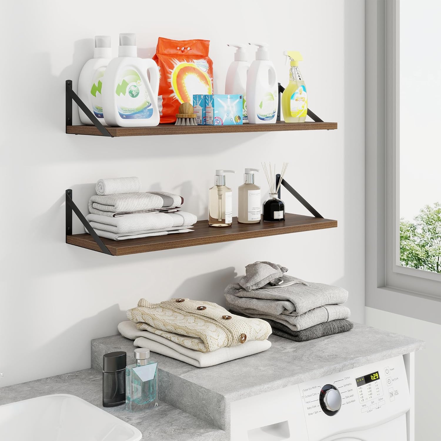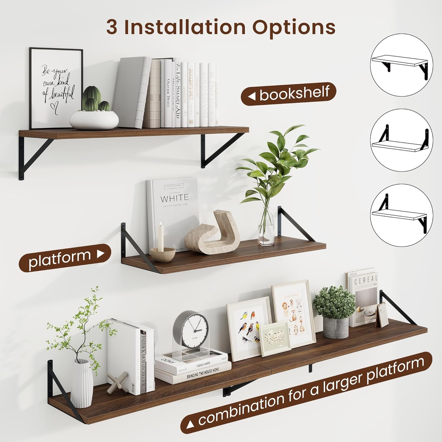 - UPGRADED MATERIAL & BRACKETS - Our wall shelves use thickened engineering wood boards paired with triangular brackets, combining aesthetics with load-bearing strength. These shelves are built to withstand the test of time, resisting deformation and breakage while providing unparalleled support for your belongings