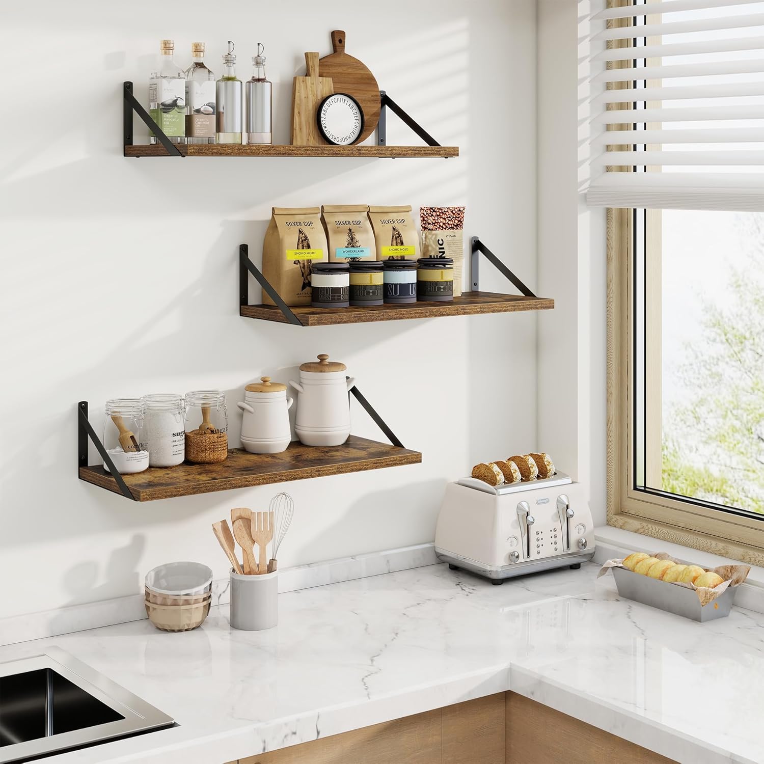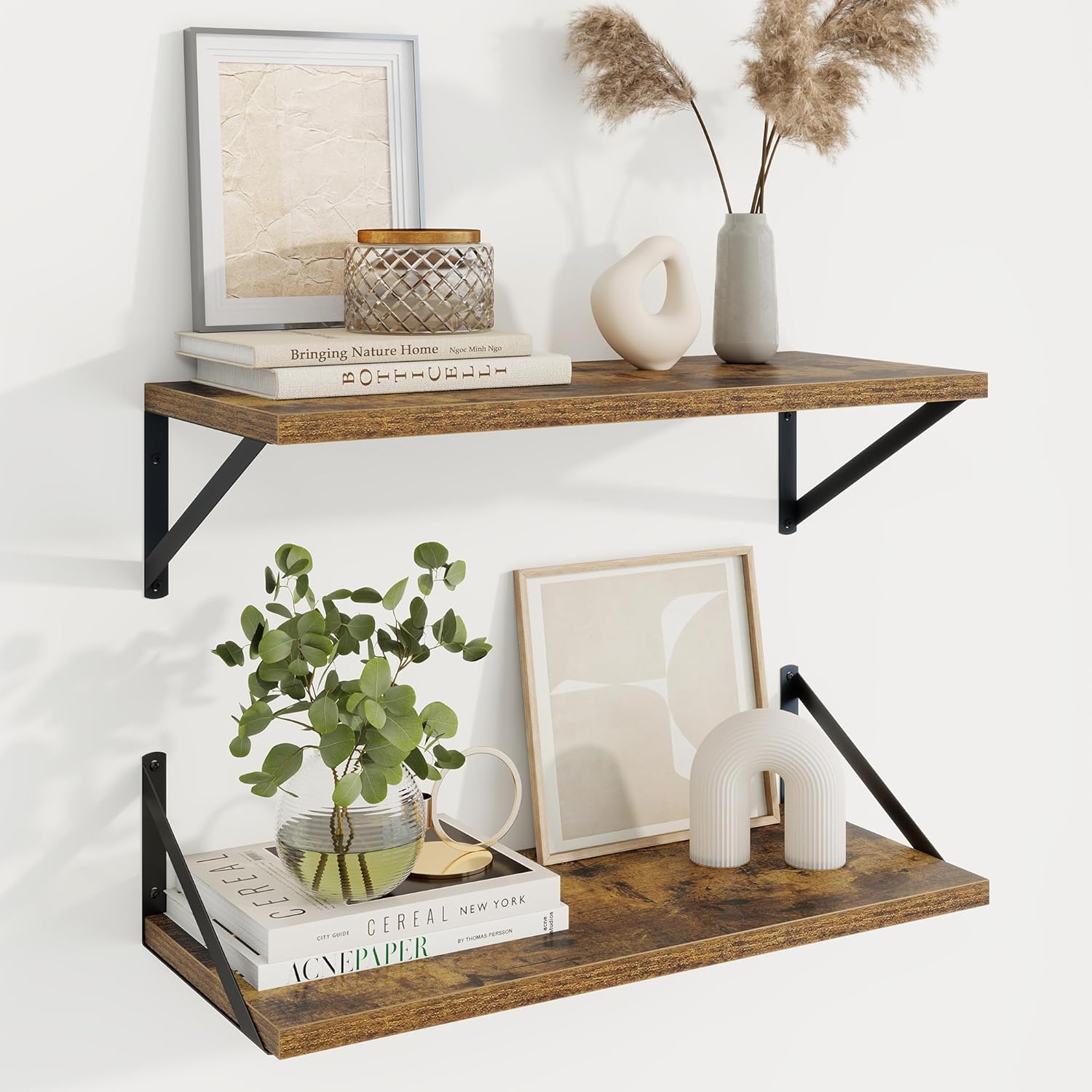 - UPGRADED MATERIAL & BRACKETS - Our wall shelves use thickened engineering wood boards paired with triangular brackets, combining aesthetics with load-bearing strength. These shelves are built to withstand the test of time, resisting deformation and breakage while providing unparalleled support for your belongings