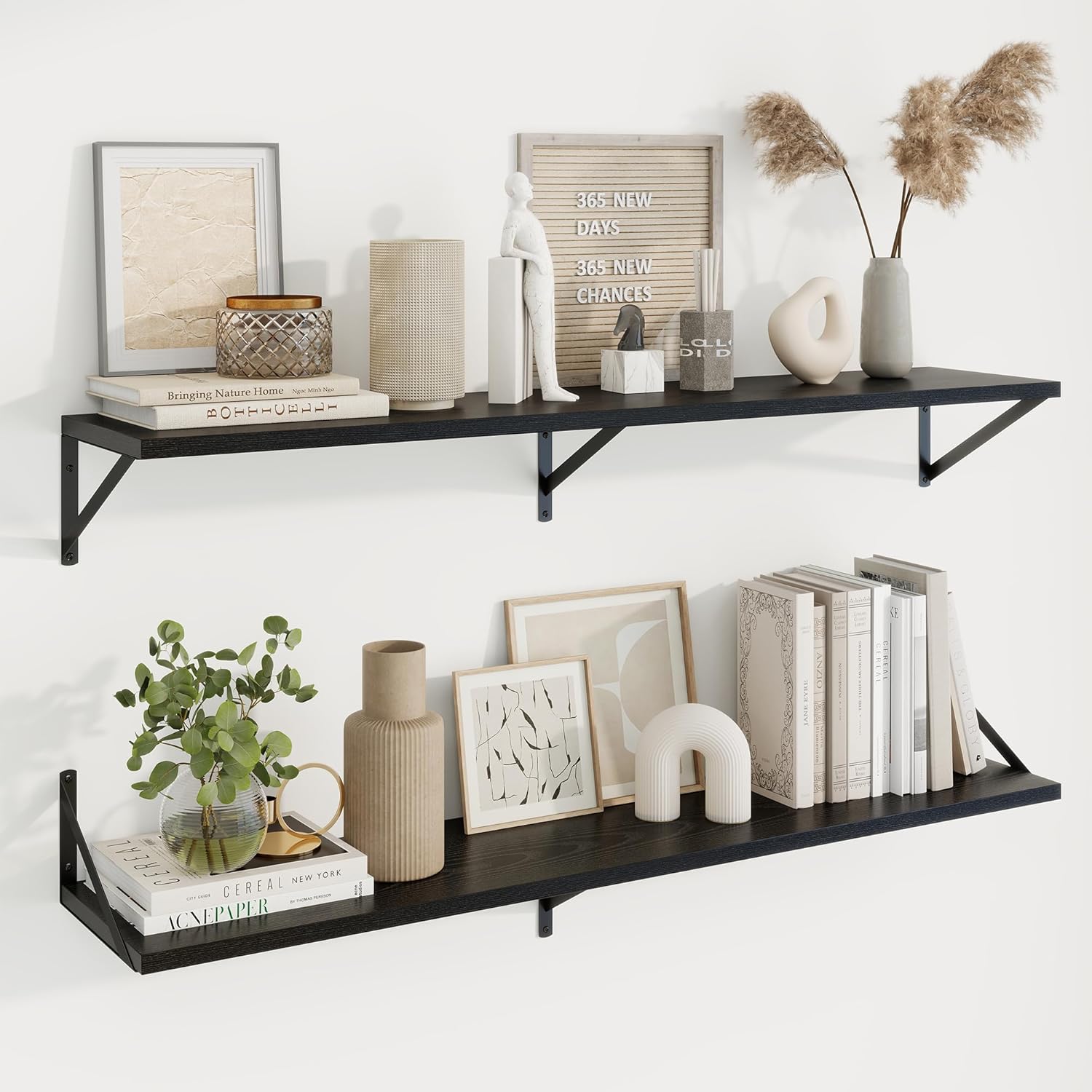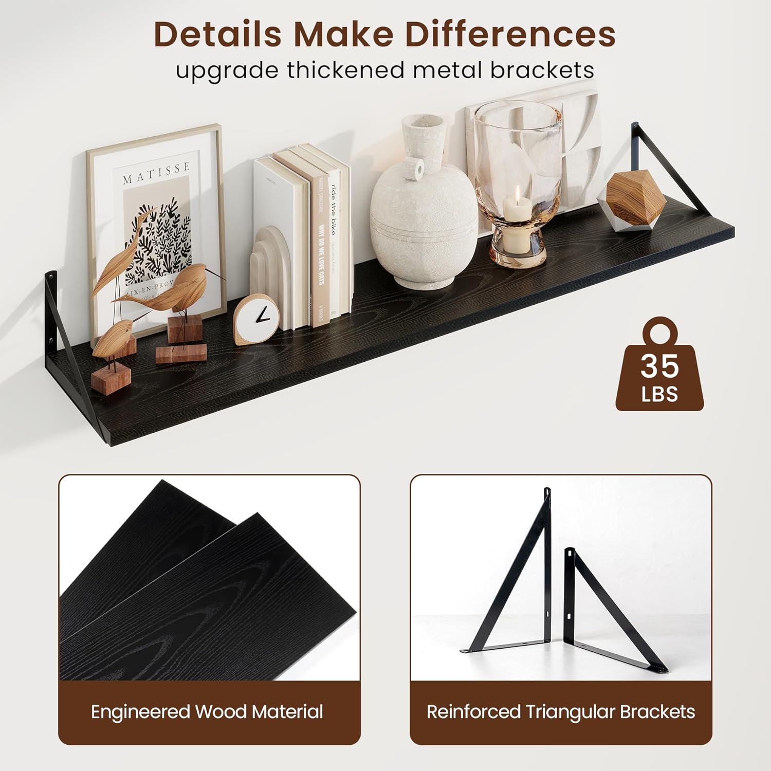 - UPGRADED MATERIAL & BRACKETS - Our wall shelves use thickened engineering wood boards paired with triangular brackets, combining aesthetics with load-bearing strength. These shelves are built to withstand the test of time, resisting deformation and breakage while providing unparalleled support for your belongings