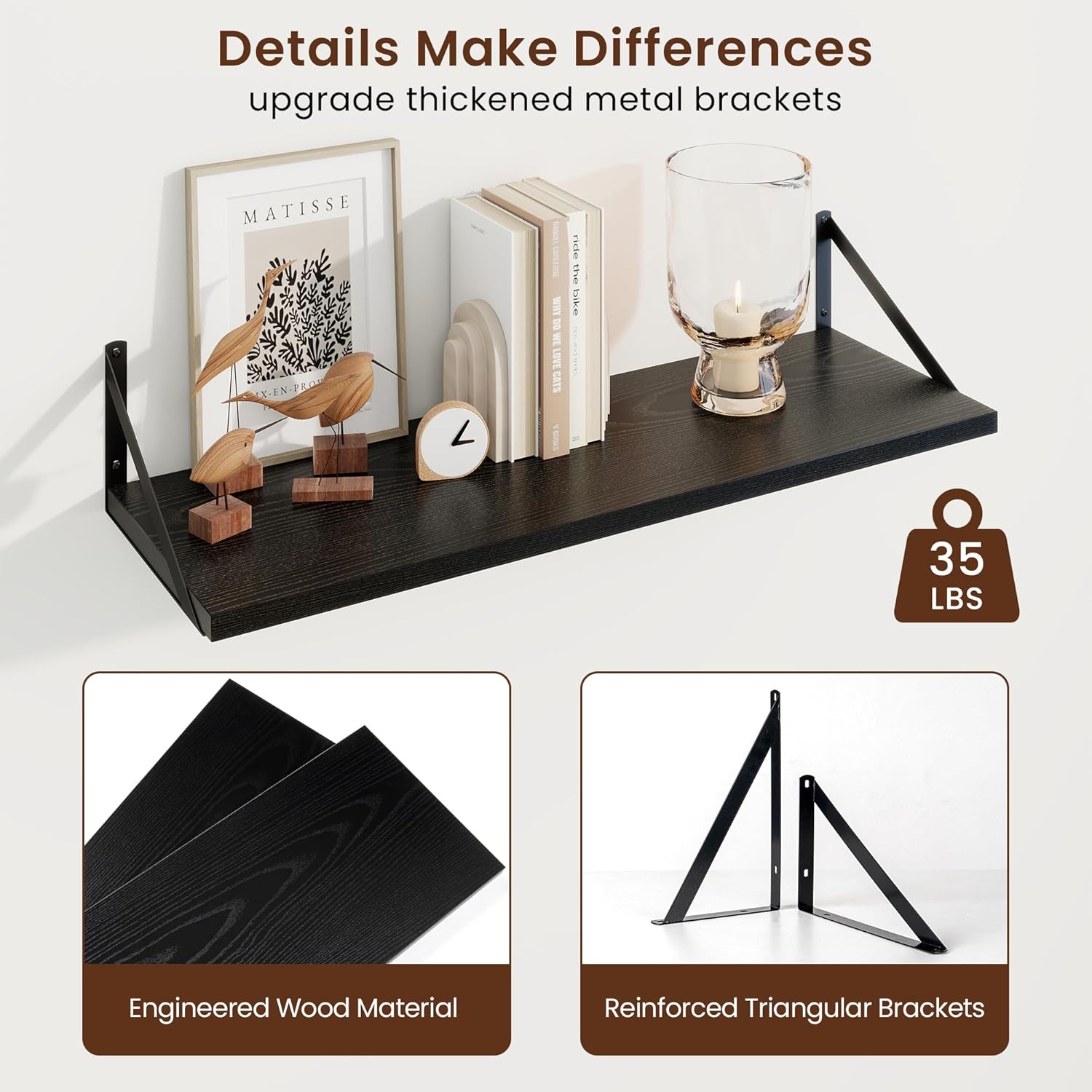- UPGRADED MATERIAL & BRACKETS - Our wall shelves use thickened engineering wood boards paired with triangular brackets, combining aesthetics with load-bearing strength. These shelves are built to withstand the test of time, resisting deformation and breakage while providing unparalleled support for your belongings