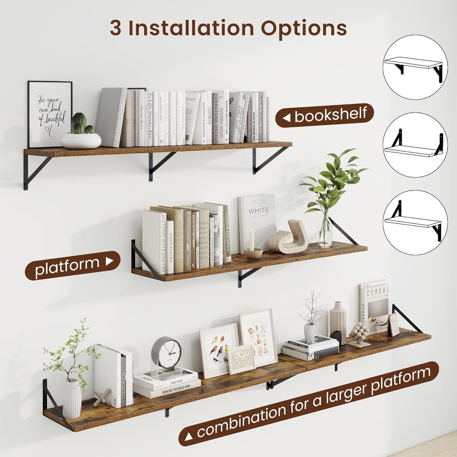 - UPGRADED MATERIAL & BRACKETS - Our wall shelves use thickened engineering wood boards paired with triangular brackets, combining aesthetics with load-bearing strength. These shelves are built to withstand the test of time, resisting deformation and breakage while providing unparalleled support for your belongings