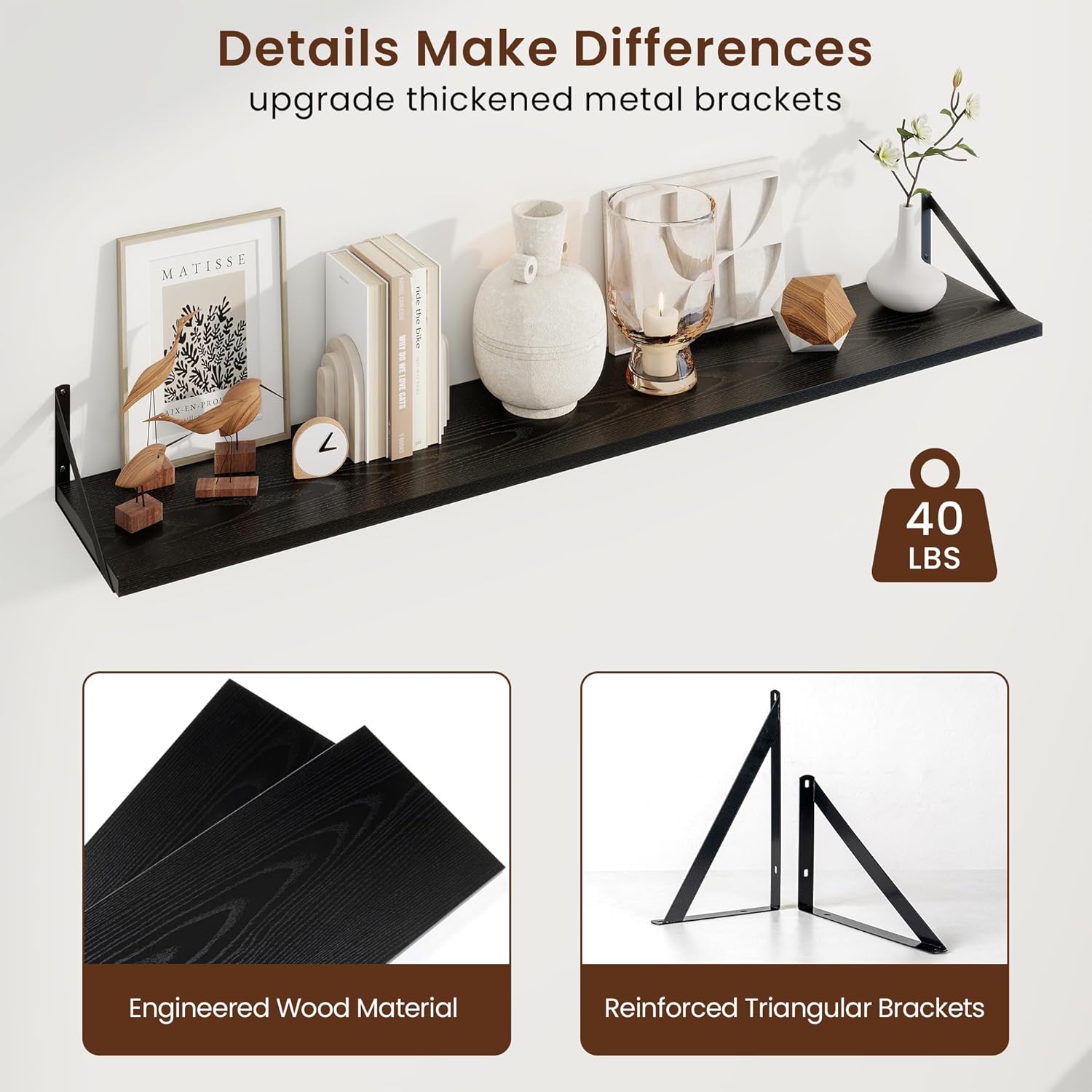 - UPGRADED MATERIAL & BRACKETS - Our wall shelves use thickened engineering wood boards paired with triangular brackets, combining aesthetics with load-bearing strength. These shelves are built to withstand the test of time, resisting deformation and breakage while providing unparalleled support for your belongings