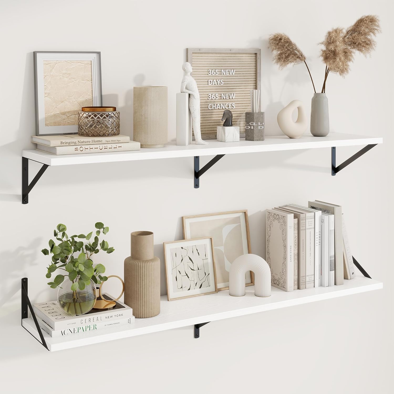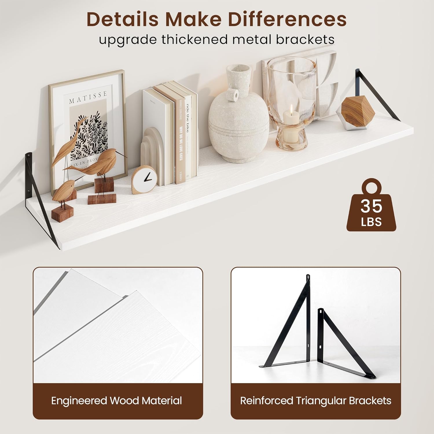 - UPGRADED MATERIAL & BRACKETS - Our wall shelves use thickened engineering wood boards paired with triangular brackets, combining aesthetics with load-bearing strength. These shelves are built to withstand the test of time, resisting deformation and breakage while providing unparalleled support for your belongings
