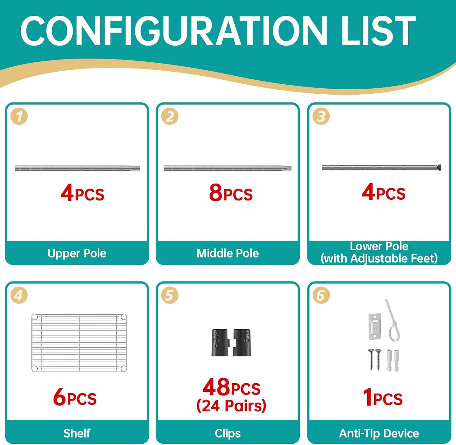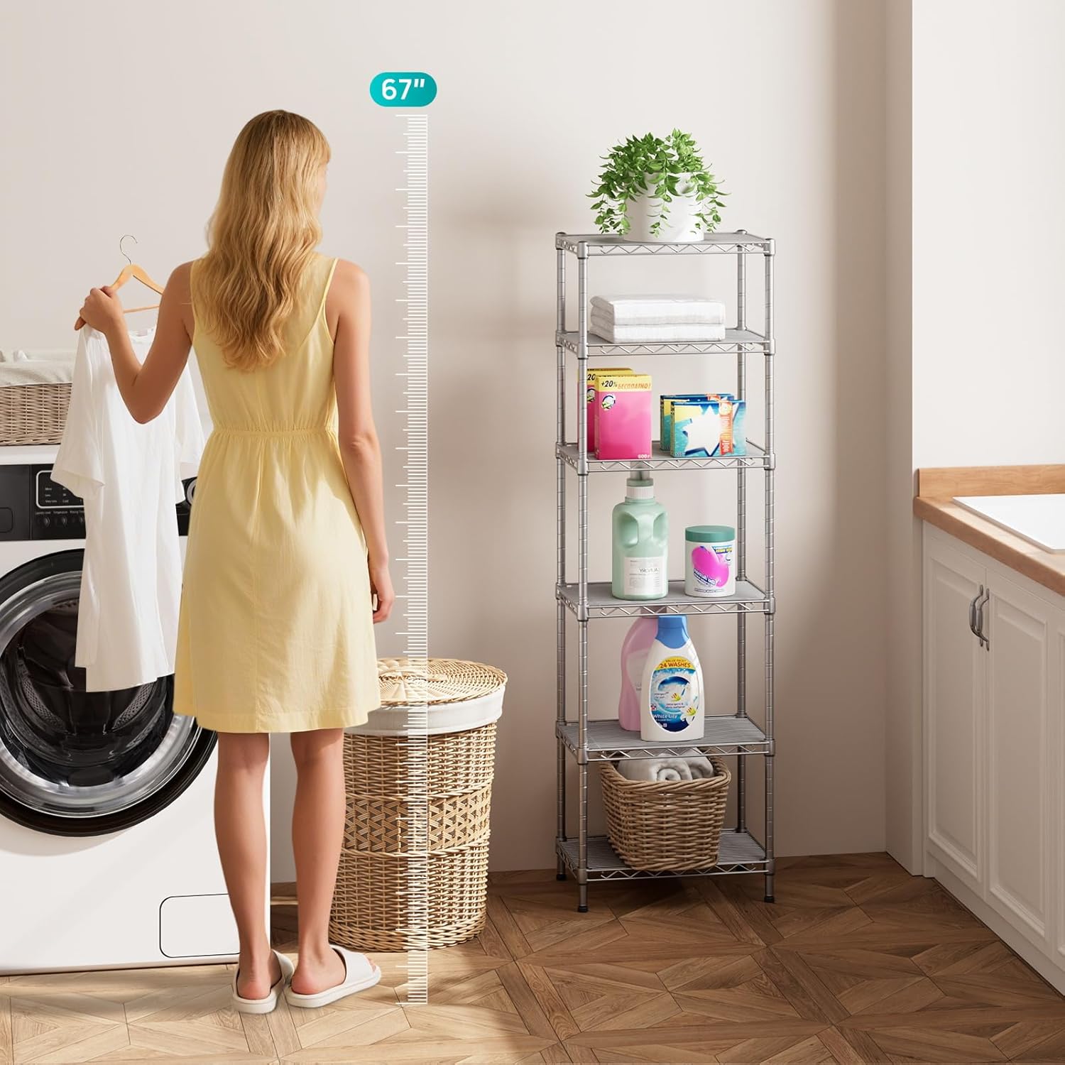 SINGAYE 6 Tier Shelf Wire Shelving Adjustable Storage Shelves Rack Standing Units for Kitchen Closet Laundry Bathroom Organizers Metal Pantry Narrow Mesh Gaps 10" D x 16" W x 60" H Gray