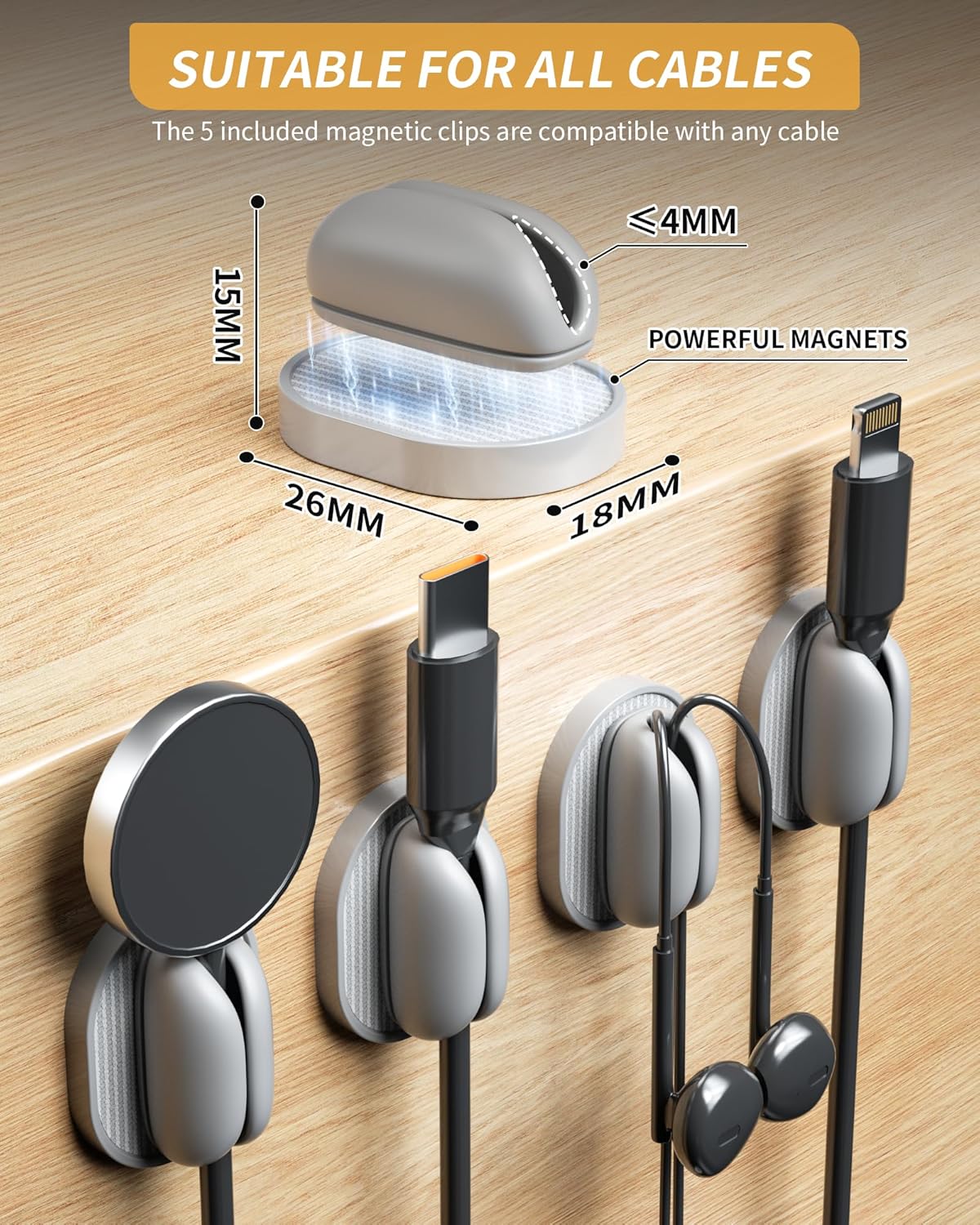 6 Pack Magnetic Cable Clips, Adjustable Cord Holder for Under Desk Cable Management, Adhesive Charger Wire Organizer Keeper for Home Office Desk Phone Car Wall Desktop Nightstand (Gray)