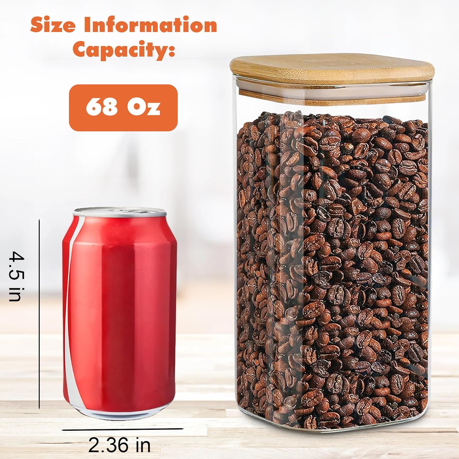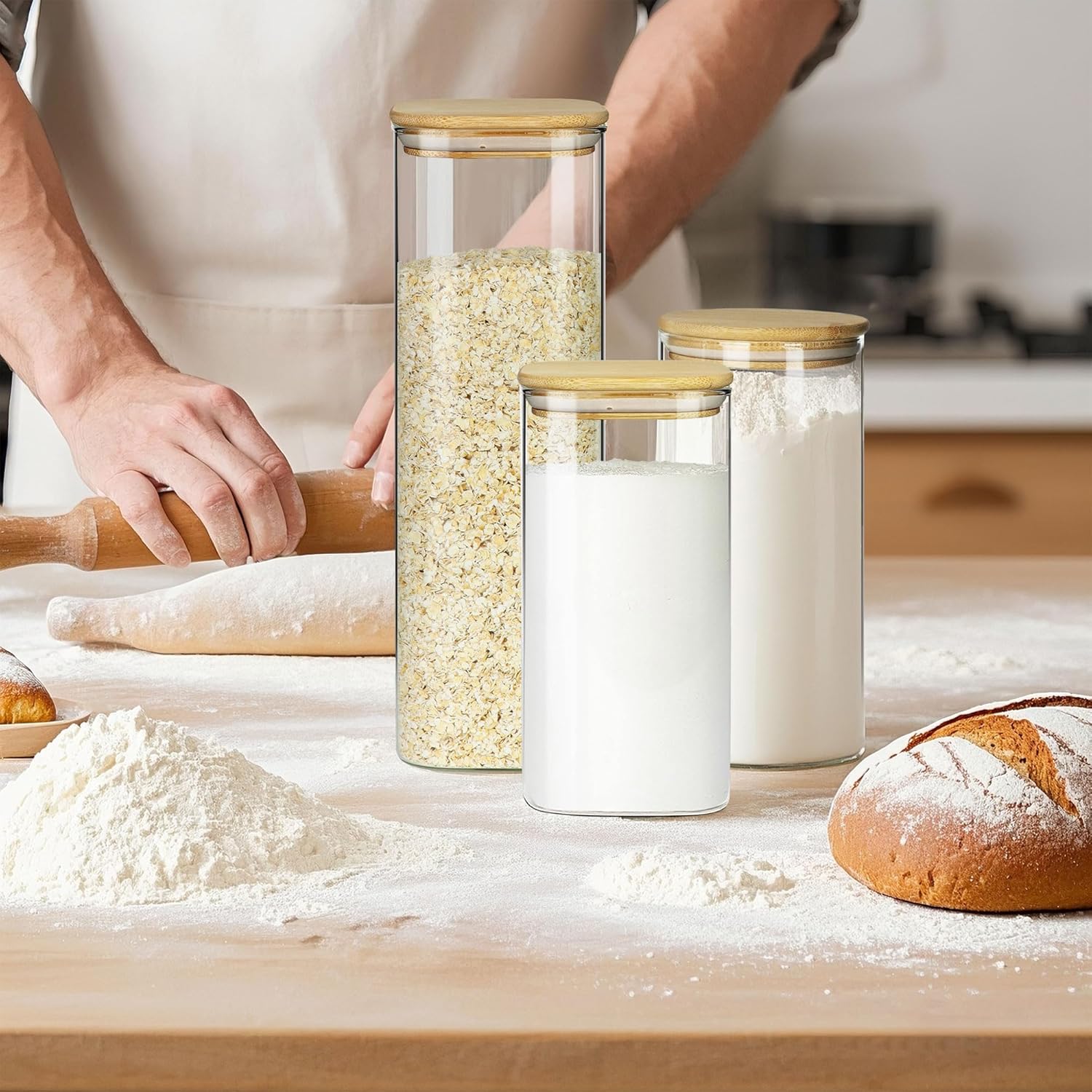 Glass Storage Containers with Airtight Bamboo Lids Set of 3,Pantry Food Glass Jar with Lid,Perfect for Kitchen Organization-Flour,Rice,Pasta,Sugar,Coffee Beans,Accessories Included (3 packs(68oz))