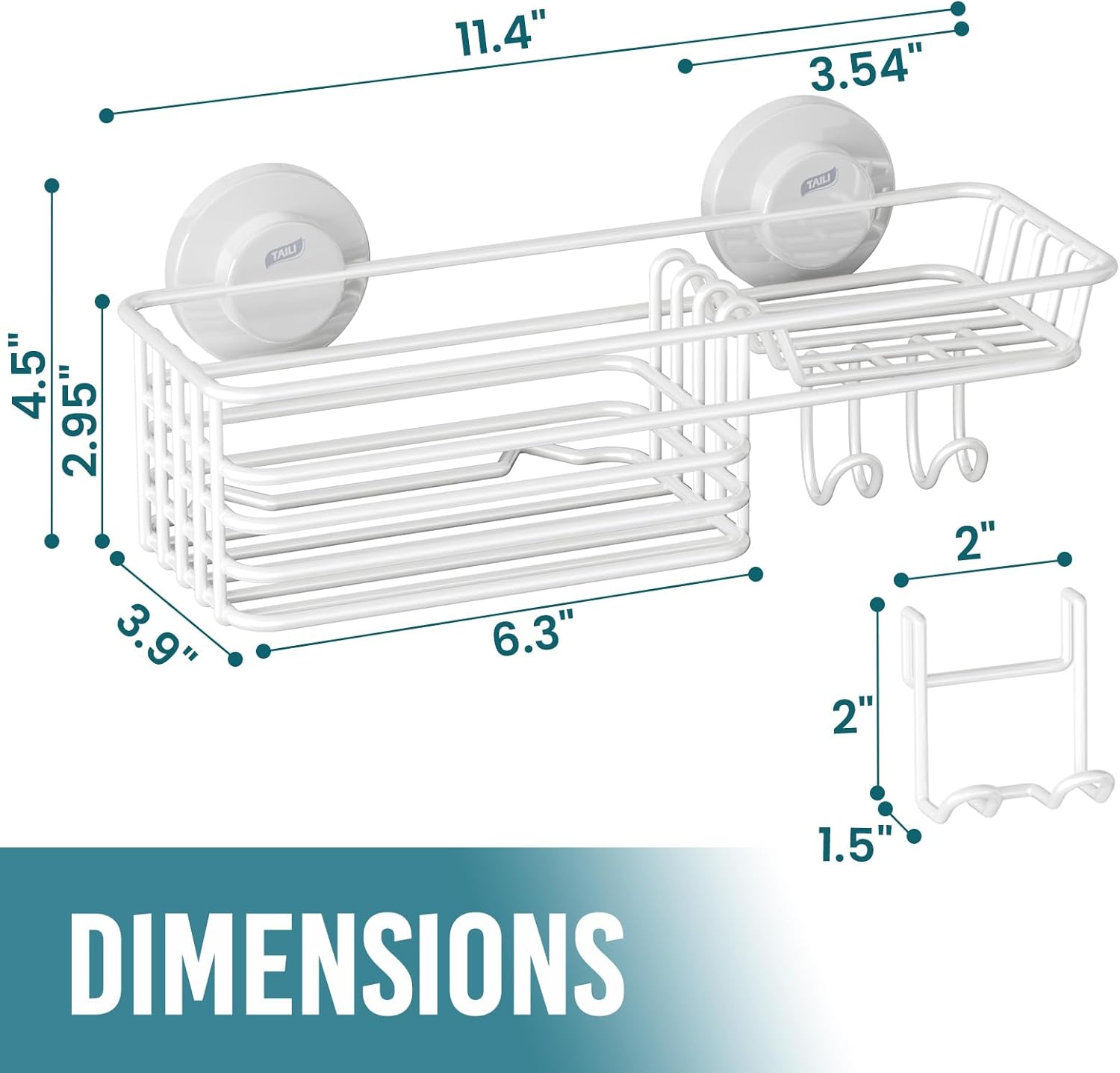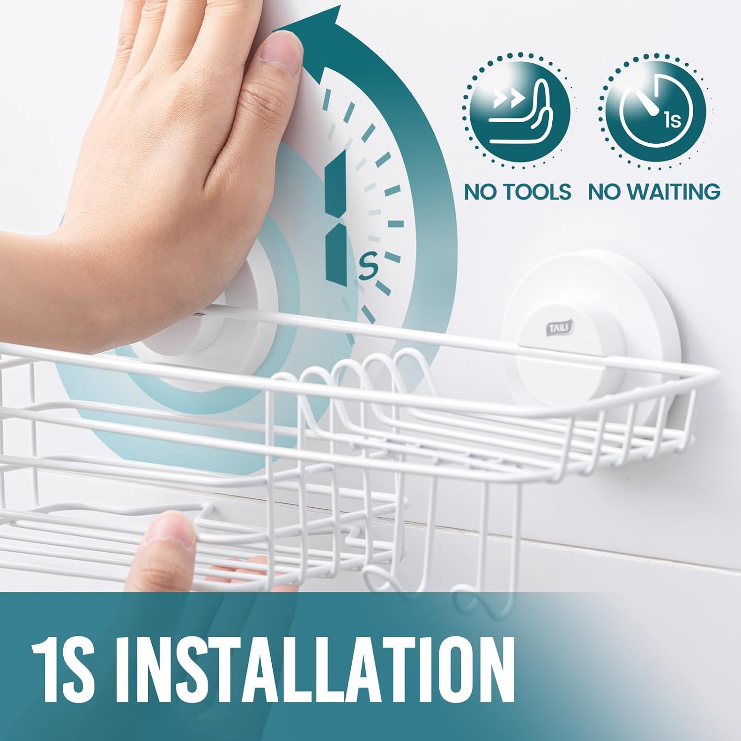 TAILI Shower Caddy Suction Cup with Hooks & Soap Holder, Heavy Duty Bathroom Shower Organizer, No Drilling Shelves for Inside Bathroom, Metal Storage Basket-White