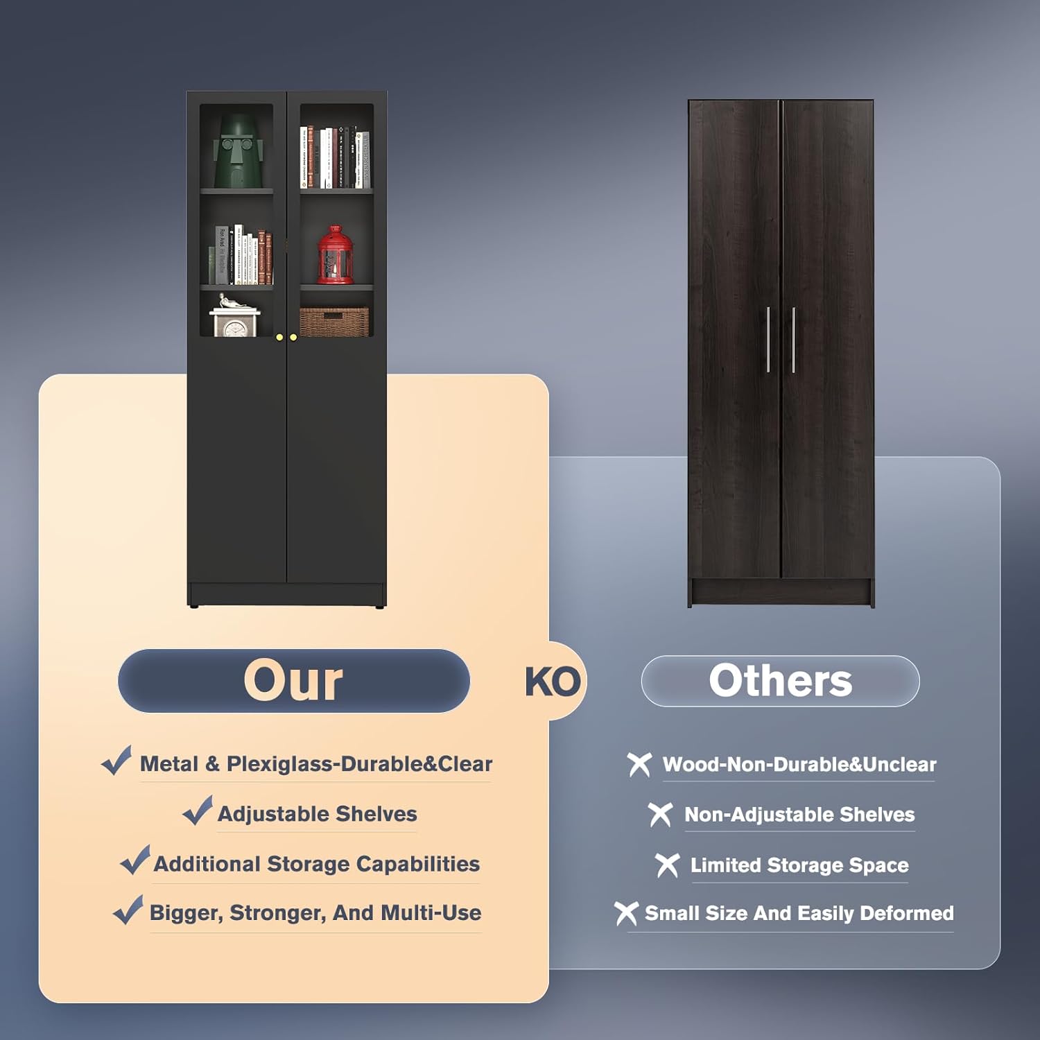 - Storage Cabinets for Multiple Purposes:A nice dust proof display cabinet to store a variety of books, collectibles, dishes, shoes, bags, and more. This steel storage cabinet can be used as a display cabinet for curios, books, artwork in your living room. It can also be used as a glass display cabinet, bookshelf, media cabinet, miscellaneous cabinet in office, bathroom, kitchen etc. With local warehouses in USA, we are able to provide fast deliveries.