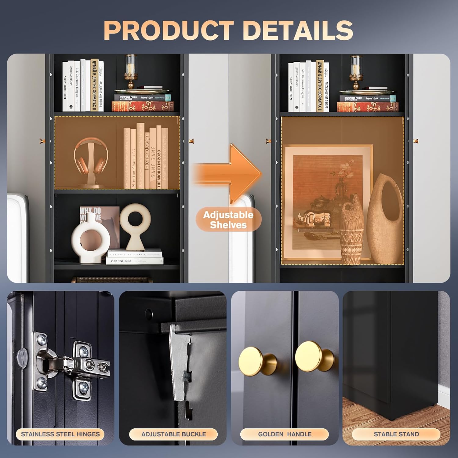 - Odor-Free Metal Furniture:With the latest power coated technology, this freestanding bookcase is nice and sturdy with no odor. Metal glass cabinet coated with phosphorus-free powder finish for resistance to chipping, scraping, corrosion and rust. keeping fresh color while good for health. The metal cabinet is resistant to scratch, corrosion and rust. Selected materials for the safety of family.
