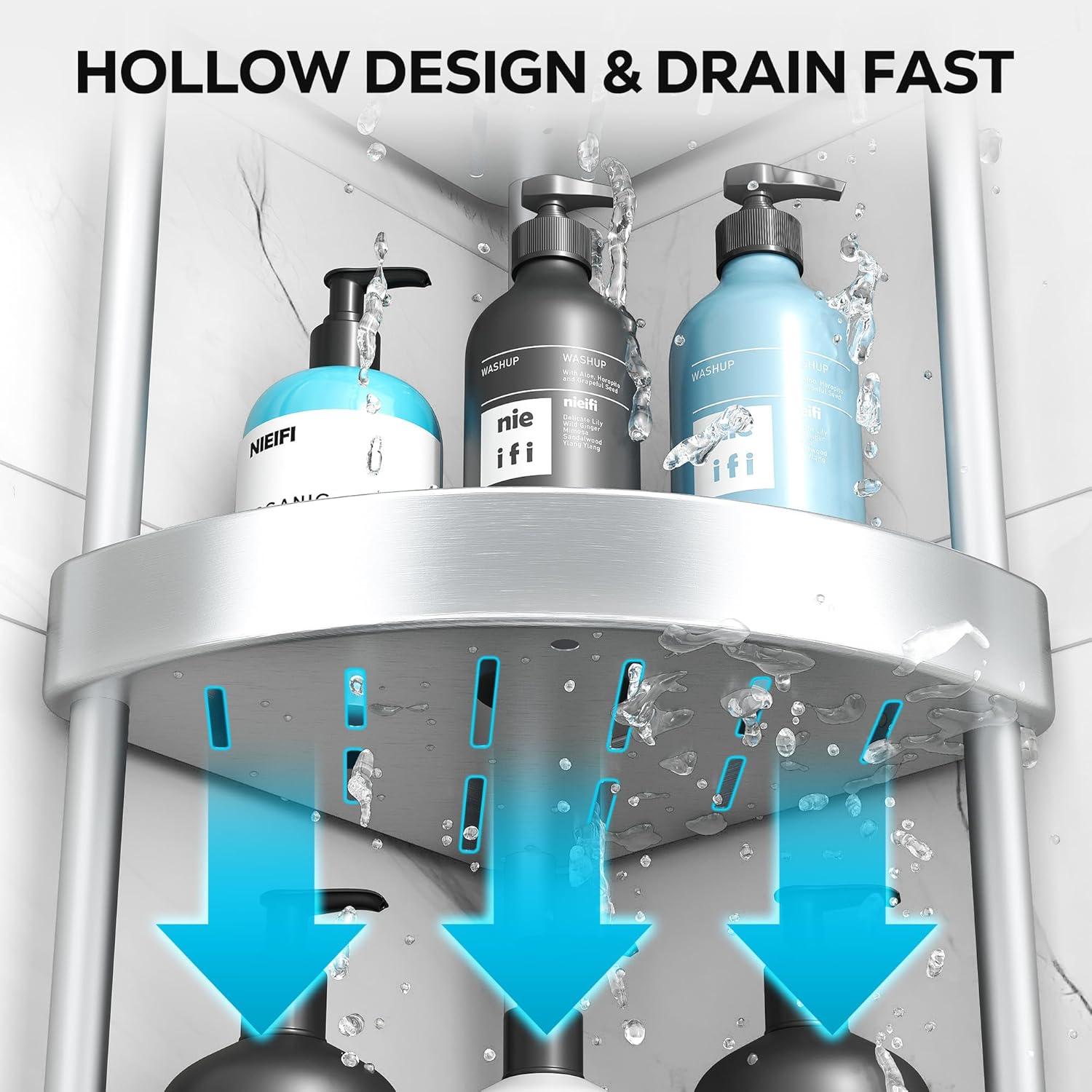 Nieifi Corner Shower Caddy Stand-4 Tier Rustproof Anodized Aluminum Standing Shower Organizer-Shower Caddy Corner-Dual Stability to Anti-Shaking-Height-Adjustable Legs for Uneven Surfaces-Silver