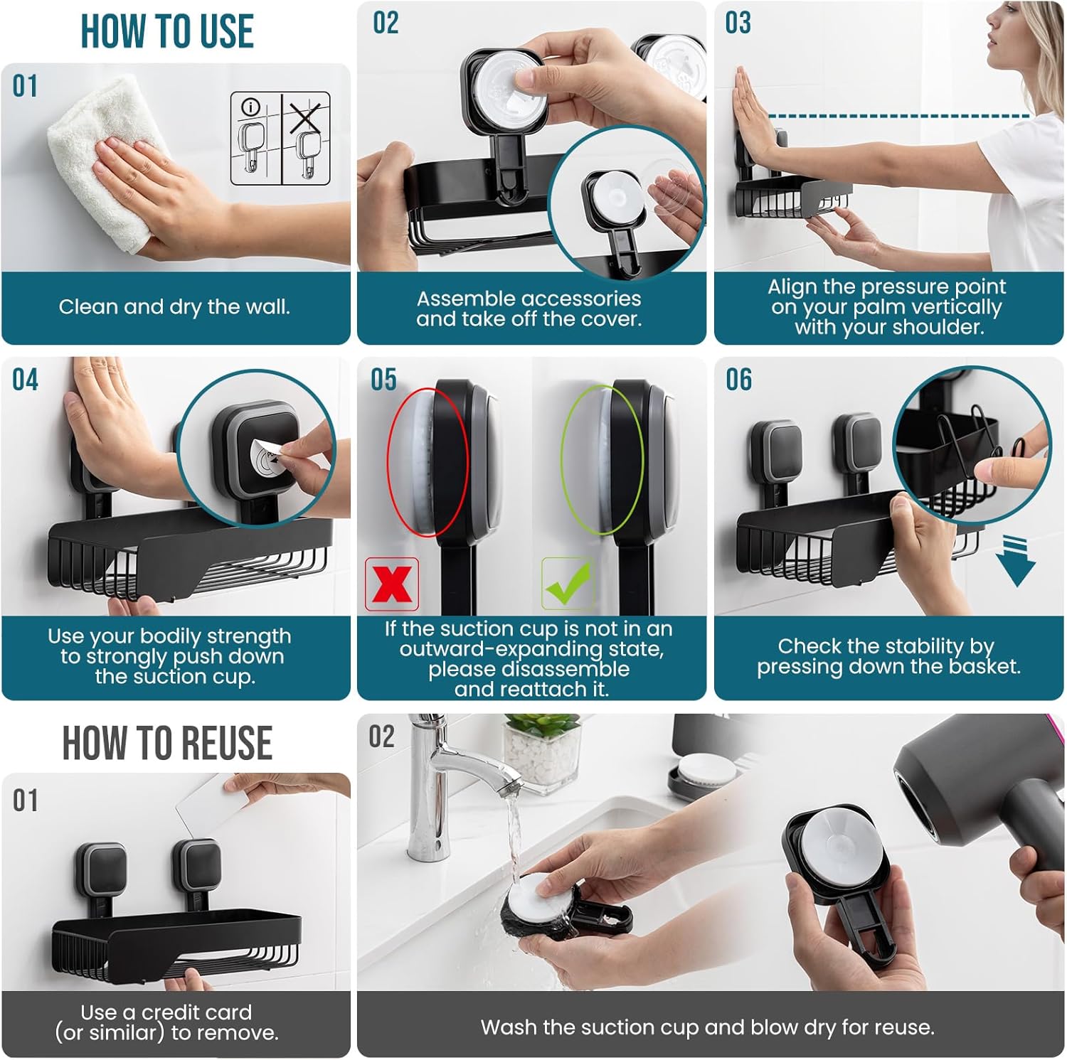 - Easy Installation & Removable: Simply press down the suction cups with palm to squeeze the air out, they will stick to the wall firmly. You can finish the installation in 1 second, and put your items in the bath organizer immediately without waiting 24h. No screws, no nails, no glue needed. Damage-free to your wall. Shower shelves can be re-positioned many times and removed without leaving sticky marks and residue