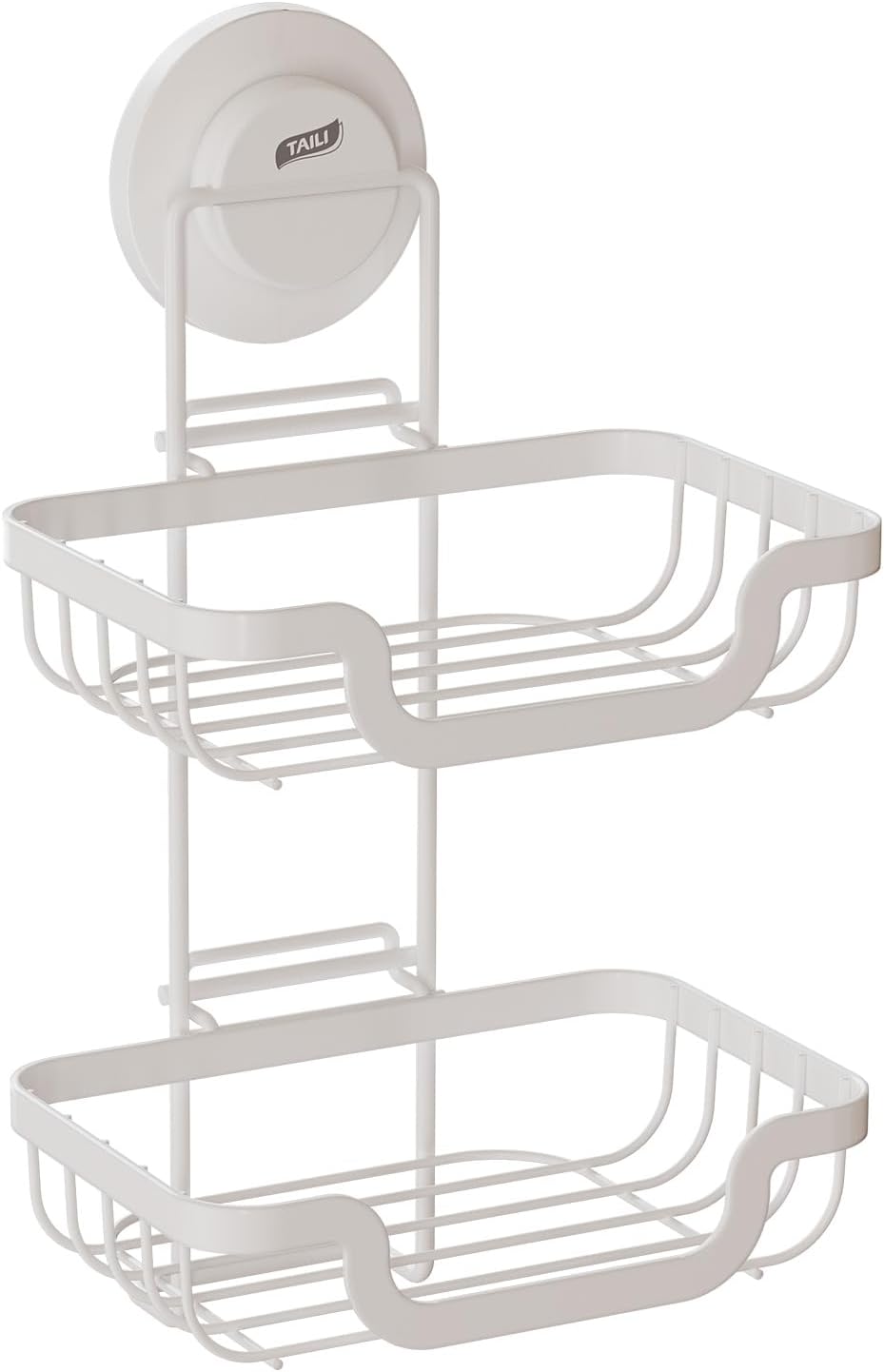 TAILI Double Layer Soap Holder, Bar Soap Dish Suction Cup for Shower Wall, Draining Saver Tray for Bathroom, Rustproof Stainless Steel Sponge Holder for Tub, Kitchen, Drill-Free, White