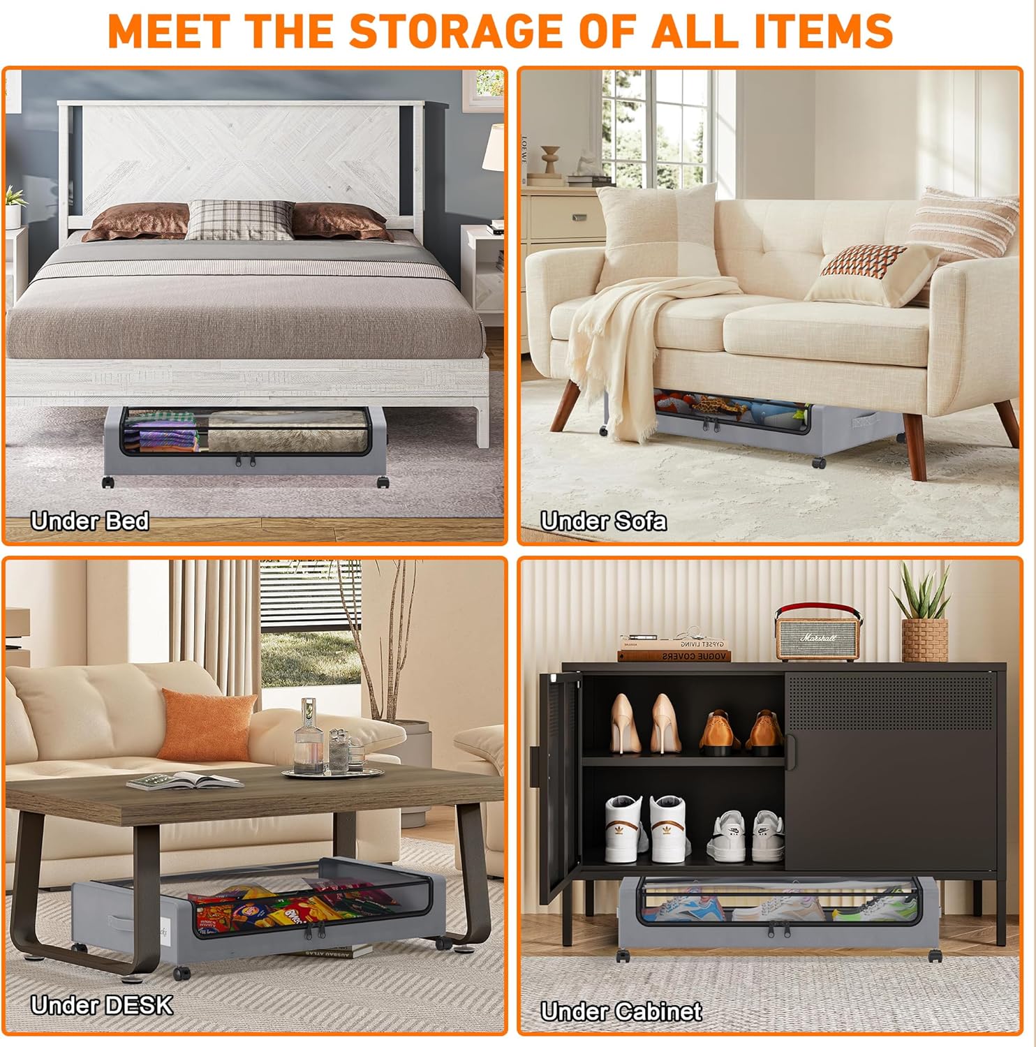 - 【Label & Clear Lid Design】Our rolling under the bed storage bins are equipped with transparent lid Windows & Label design, without having to open multiple containers or boxes, that make it easy to quickly identify the contents of your locker, Prevent items from being misstored. The bottom of the bed storage box with double zipper design and high quality material, completely keep dust, moisture and dirty things out, to ensure that your items clean and dust-free, say goodbye to clutter!