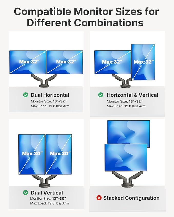 - Compatibility: To ensure compatibility with the dual monitor mount, your each monitor must meet three conditions at the same time: First, computer screens size range: 13 to 32 inches. Second, screen weight range: 4.4 to 19.8 lbs. Third, the back of the monitor screen must have VESA mounting holes with a pitch of 75x75mm or 100x100mm.