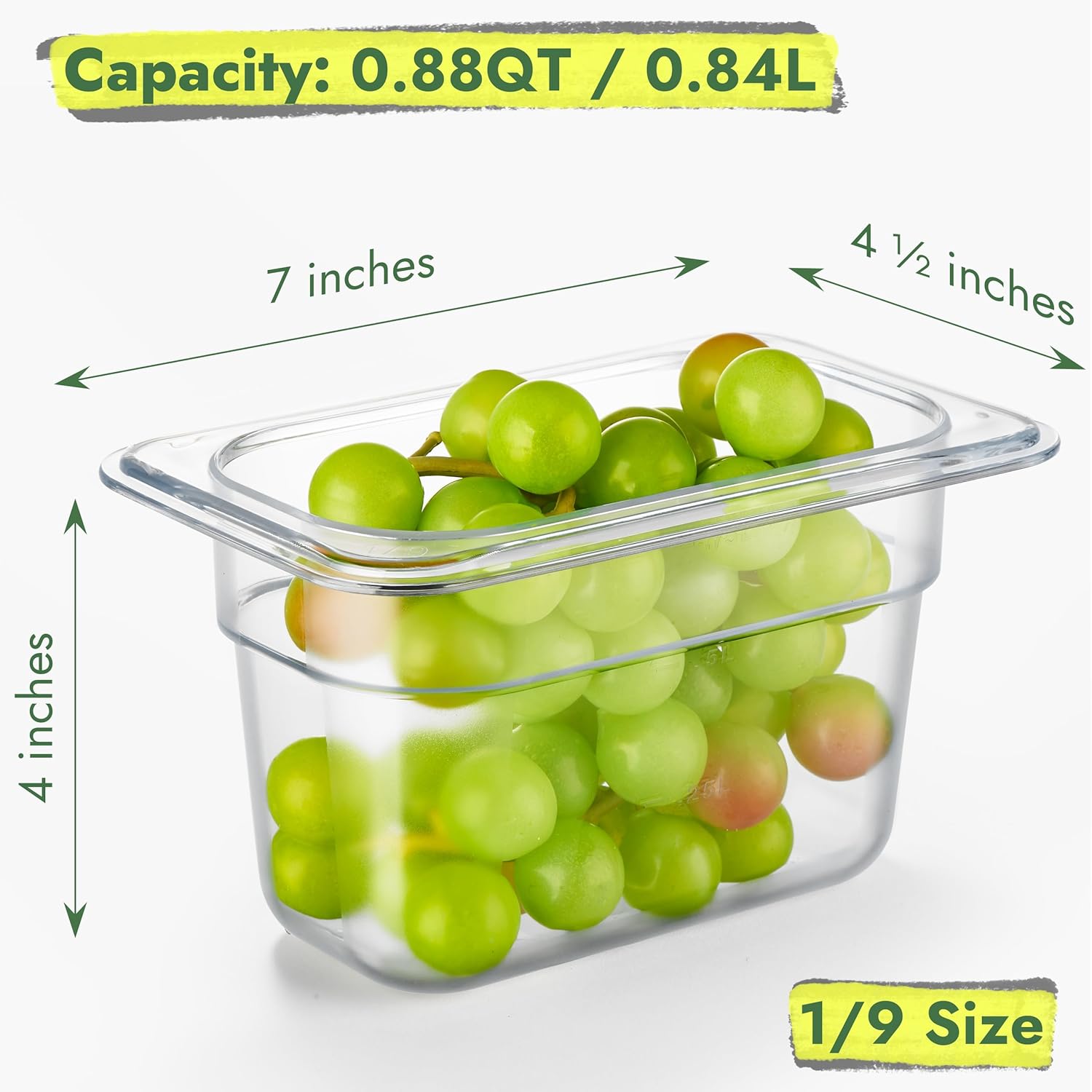 - 6-Pack 1/9 Size Food Pan and Lid Set (Total 12 pcs)– Commercial Grade - This set includes (6 pcs) 1/9 size clear polycarbonate food pans with (6 pcs) matching flat lids, ideal for commercial kitchens, salad bars, buffet lines, and prep stations. Economical and reliable for high-volume foodservice environments. NSF listed to meet health and safety standards for public food handling.