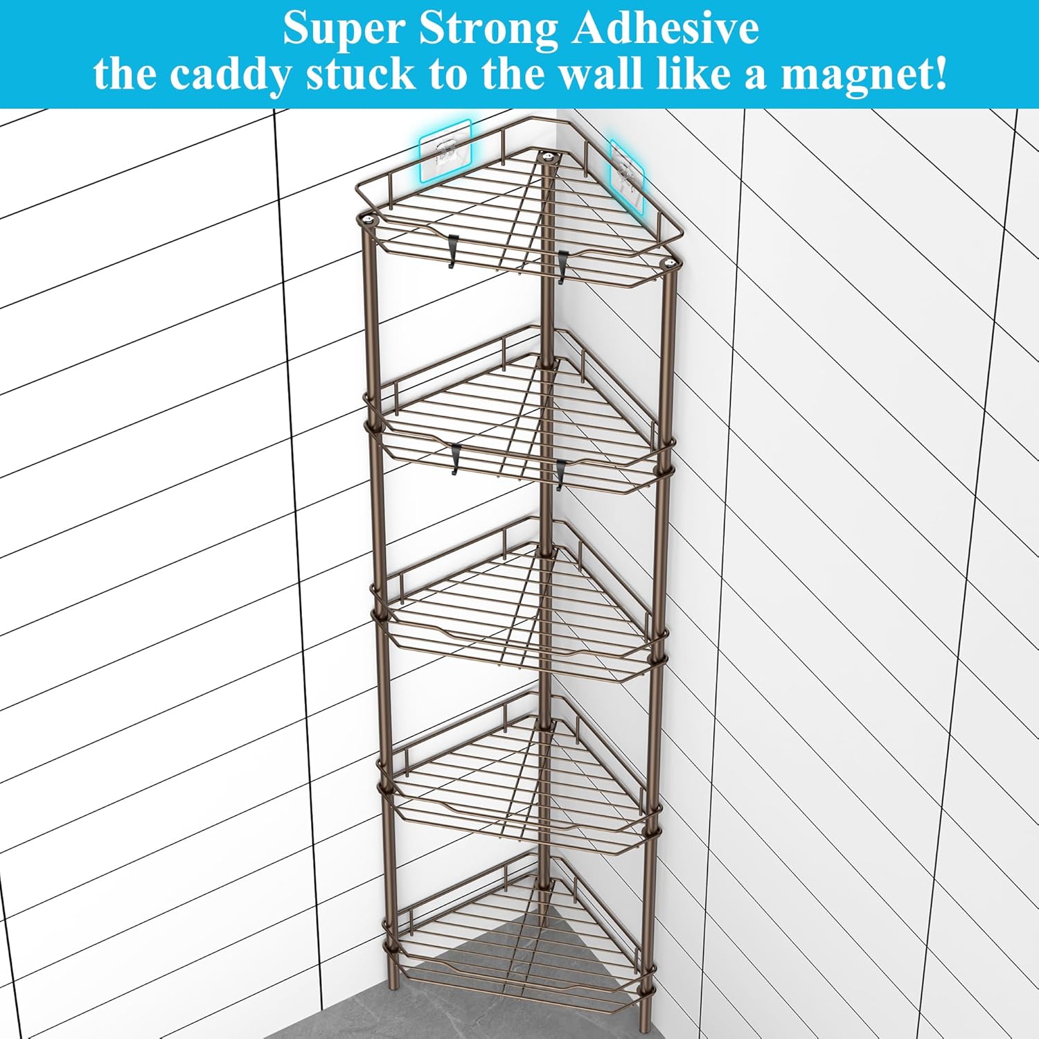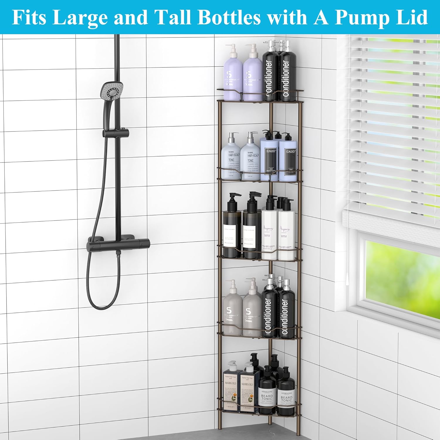 5 Tier Floor Standing Corner Shower Caddy Organizer Shelf with Hooks, Bathroom Shelves Stand Rack, Bronze