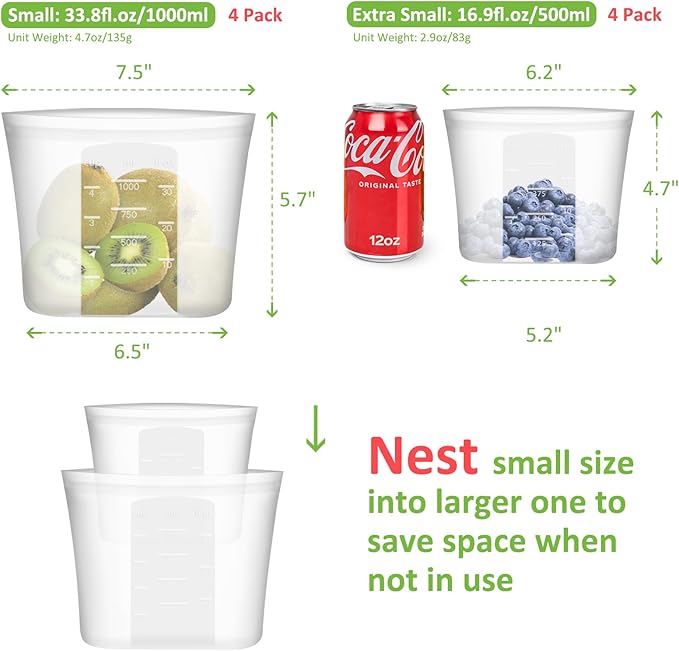 - 【THOUGHTFUL & ECONOMICAL】You'll receive 4 Small size 33.8fl.oz/4cup/1000ml(Quart size for sandwich) and 4 Extra Small snack size 16.9fl.oz/2cup/500ml in translucent color. Reusable silicone food storage bags come with clearly volume marks in cups, milliliters and fluid ounces for easy use. Translucent body easy to see what's inside, though not in crystal clear. Plus, one silicone bag can reduce up to 300+ single-use plastic bags a year, helping to create a waste-free world