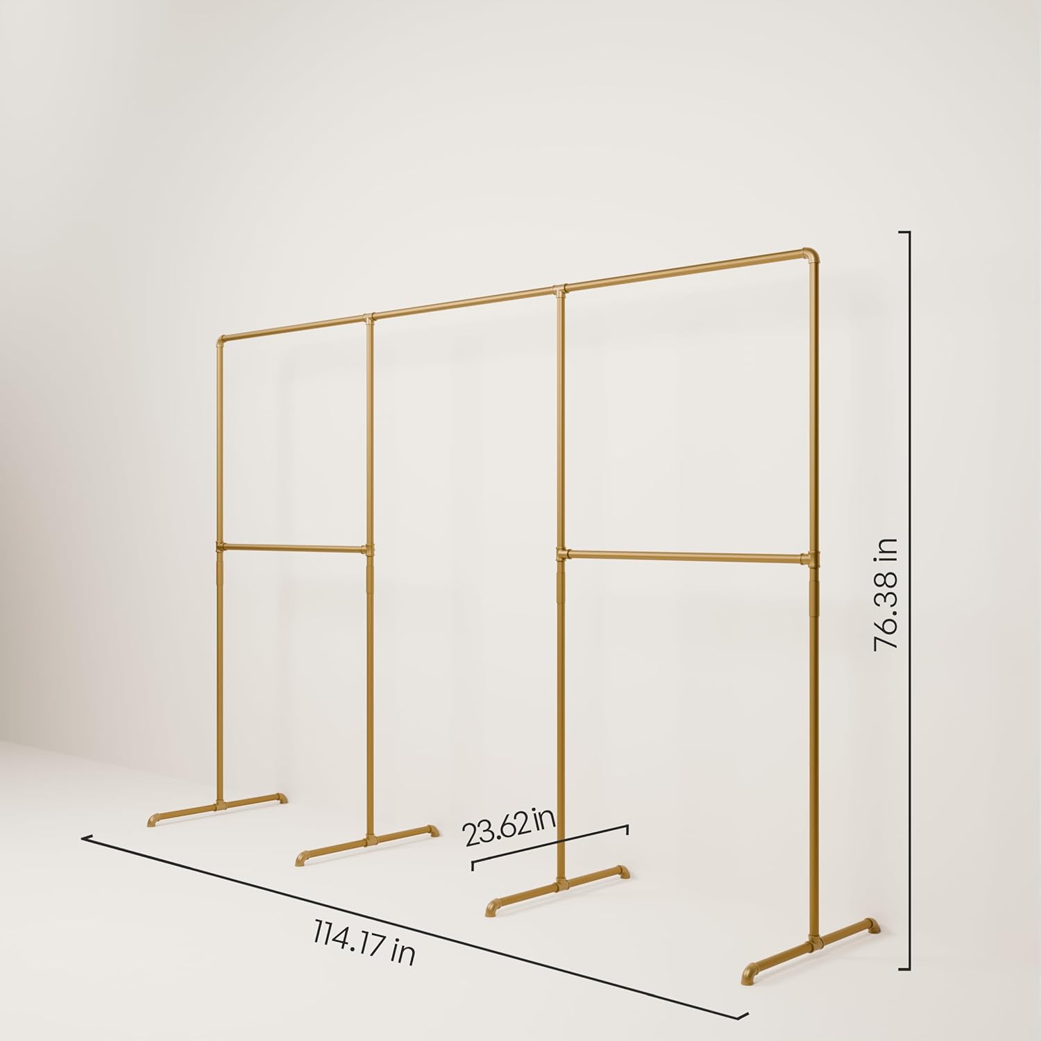 pamo Gold Clothing Rack – 114.17" W x 76.38" H – Industrial Pipe Metal Garment Organizer for Bedroom or Retail – Heavy-Duty Clothes Rack – Easy Assembly