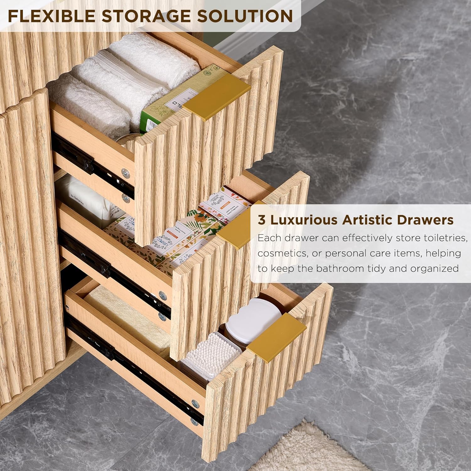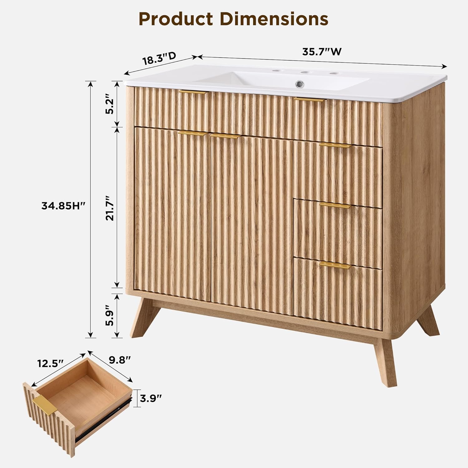 T4TREAM 36" Fluted Bathroom Vanity with Ceramic Sink Combo,Freestanding Modern Bathroom Storage Vanity Cabinet with 2 Soft Closing Doors & 3 Drawers,Wood Grain Texture,Metal Handle,Natural Oak