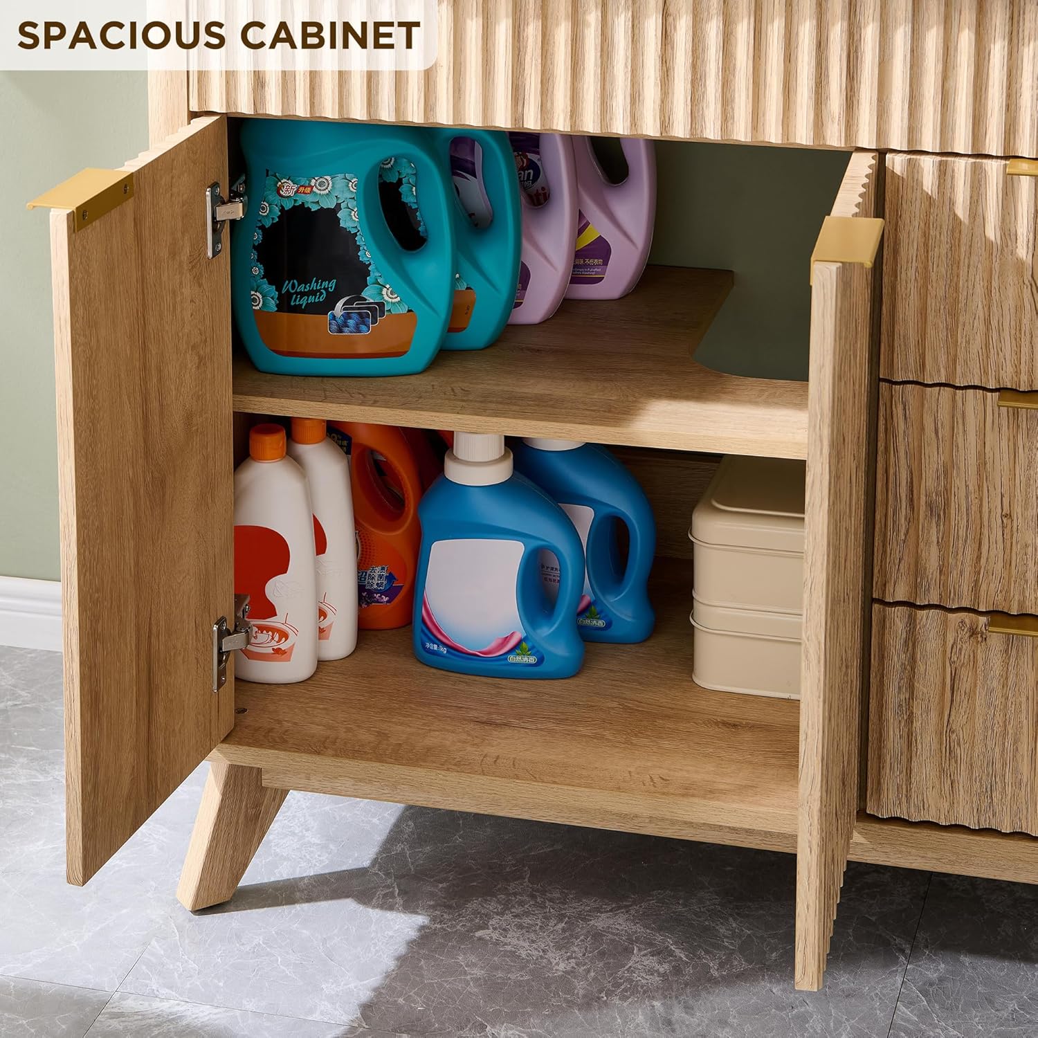 - Stable and Durable:Made from FSC-Certified wood, optimal MDF, P2 engineered wood. The fluted panel uses blister molding tech,ensures long-term durability and water resistance. Equipped with a soft-closing hinge mechanism, providing a quiet and smooth closure, even when closed quickly, without any noise. The outward-facing four-legged design ensures the reliability and stability of this piece of furniture.Made from FSC-Certified engineered wood