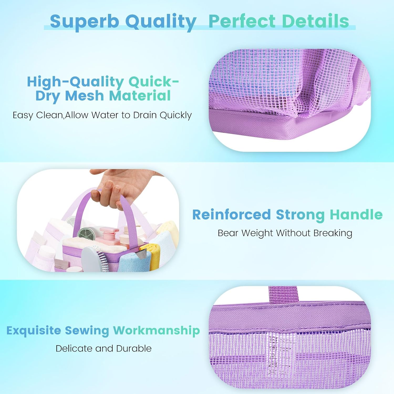 - Quick Drying, Effortless Cleaning:The shower caddy dorm will drain quickly and dry up naturally once it gets wet, due to the characteristics of breathable mesh fabric, preventing water buildup and odor. Directly rinse the mesh tote bag under the tap or use the washing machine instead.