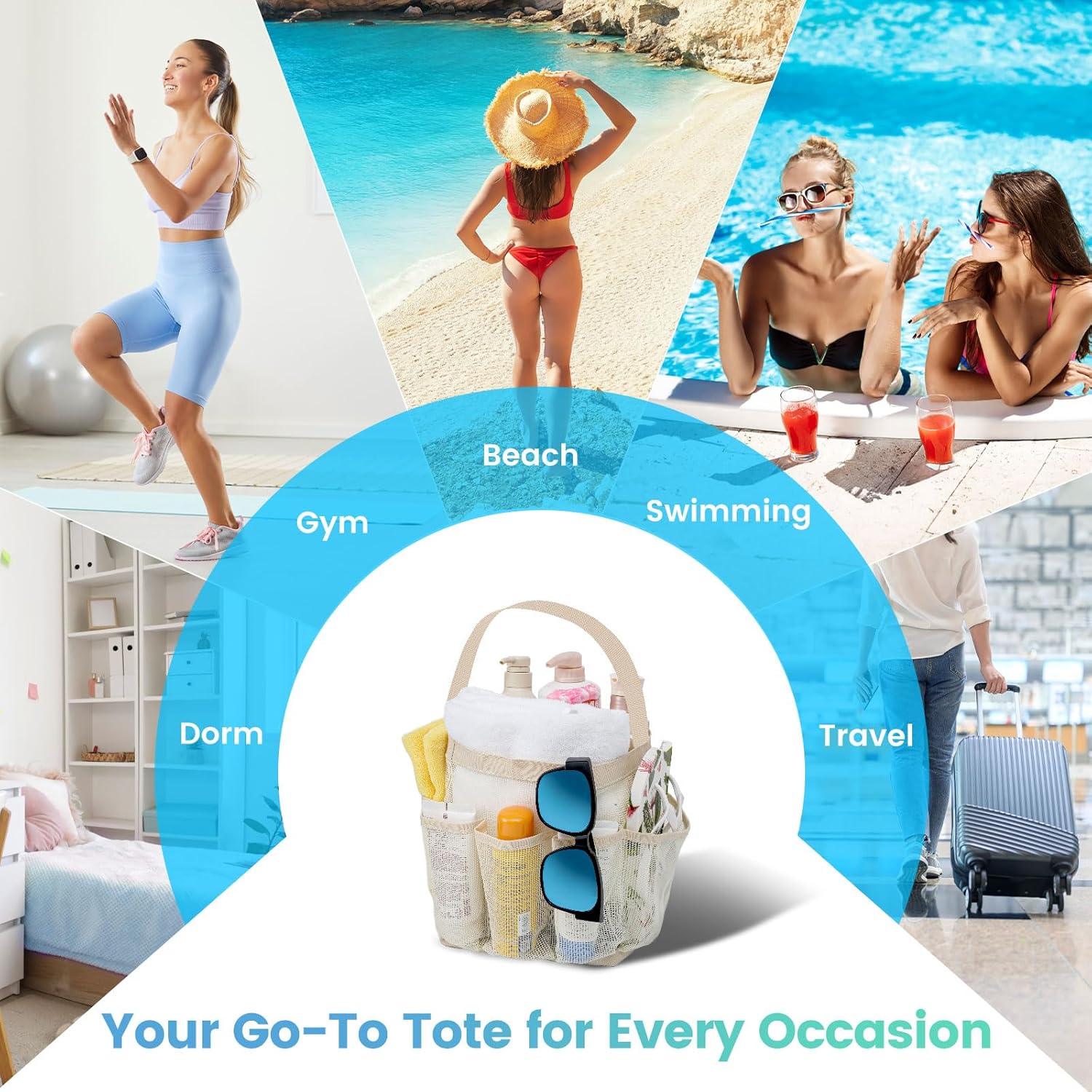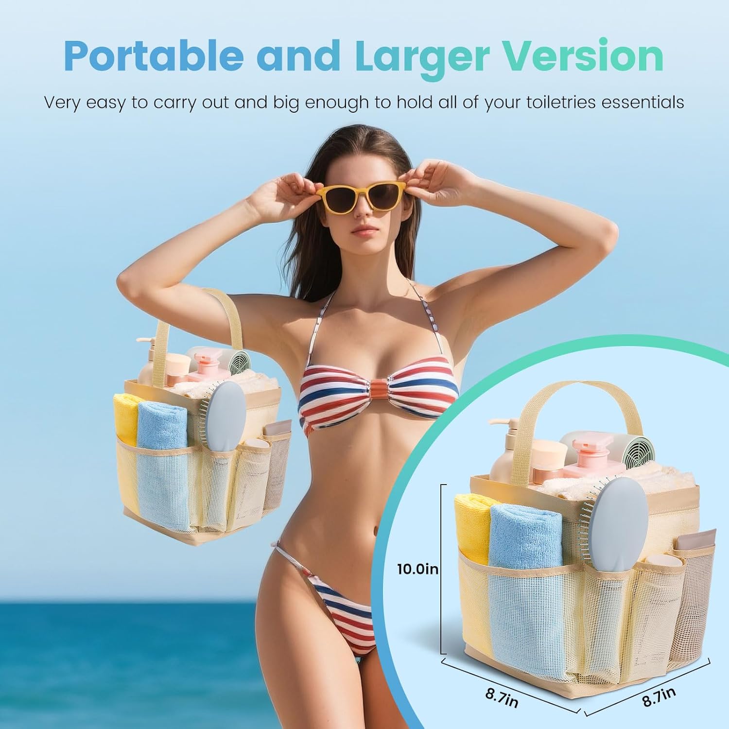 - Larger Capacity with 9 Pockets:The spacious mesh shower caddy gets 1 large center pocket and 8 side pockets to store all the essentials. A middle pocket fits larger items like shampoo, towels, and hair dryers, while side pockets fit smaller items like toothbrushes, facial cleansers, and razors.