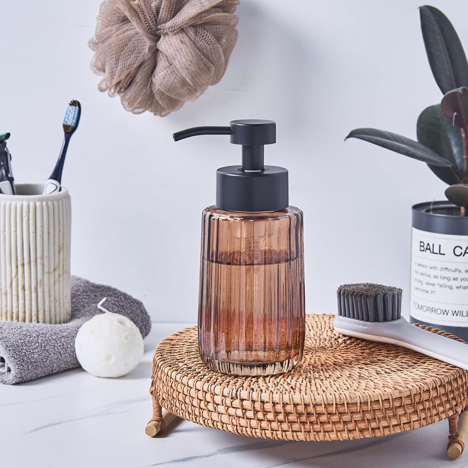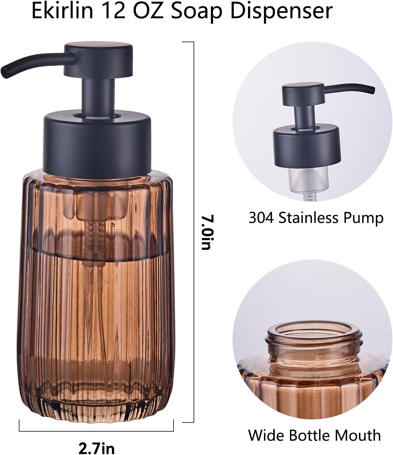 Ekirlin 12Oz Amber Glass Soap Dispenser with Black Rust Proof Stainless Steel Pump, Refillable Kitchen Soap Dispenser with Vertical Stripe, Bathroom soap Dispenser for Dispense Hand soap, Dish Soap