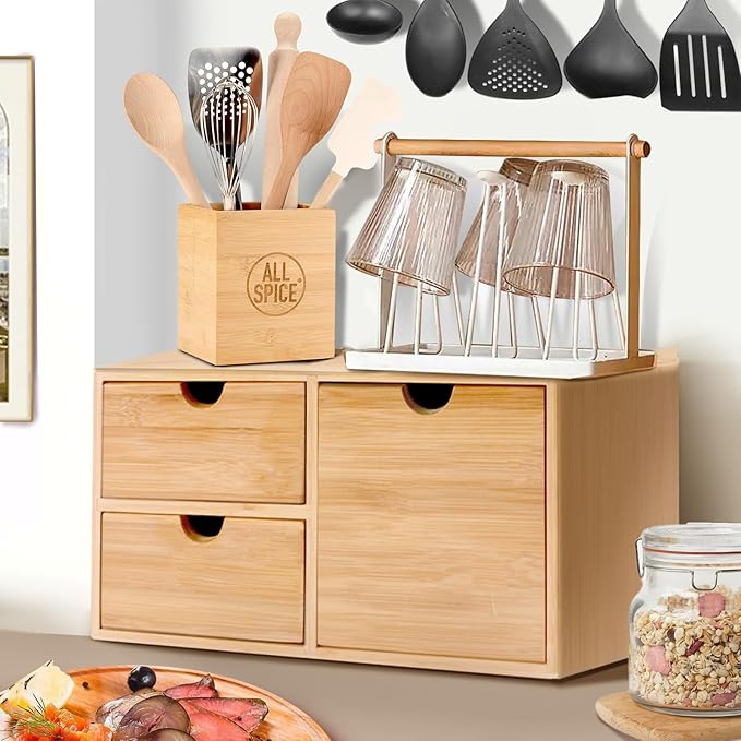 - No Need to Assemble and Space-Saving - This bamboo countertop drawer organizer works great to eliminate clutter and free cabinet space. Fits for any counter, tabletops, desk, cubicles, shelves, vanity. Suitable for home, study, bathroom, office or school. It is fully assembled, easy to use