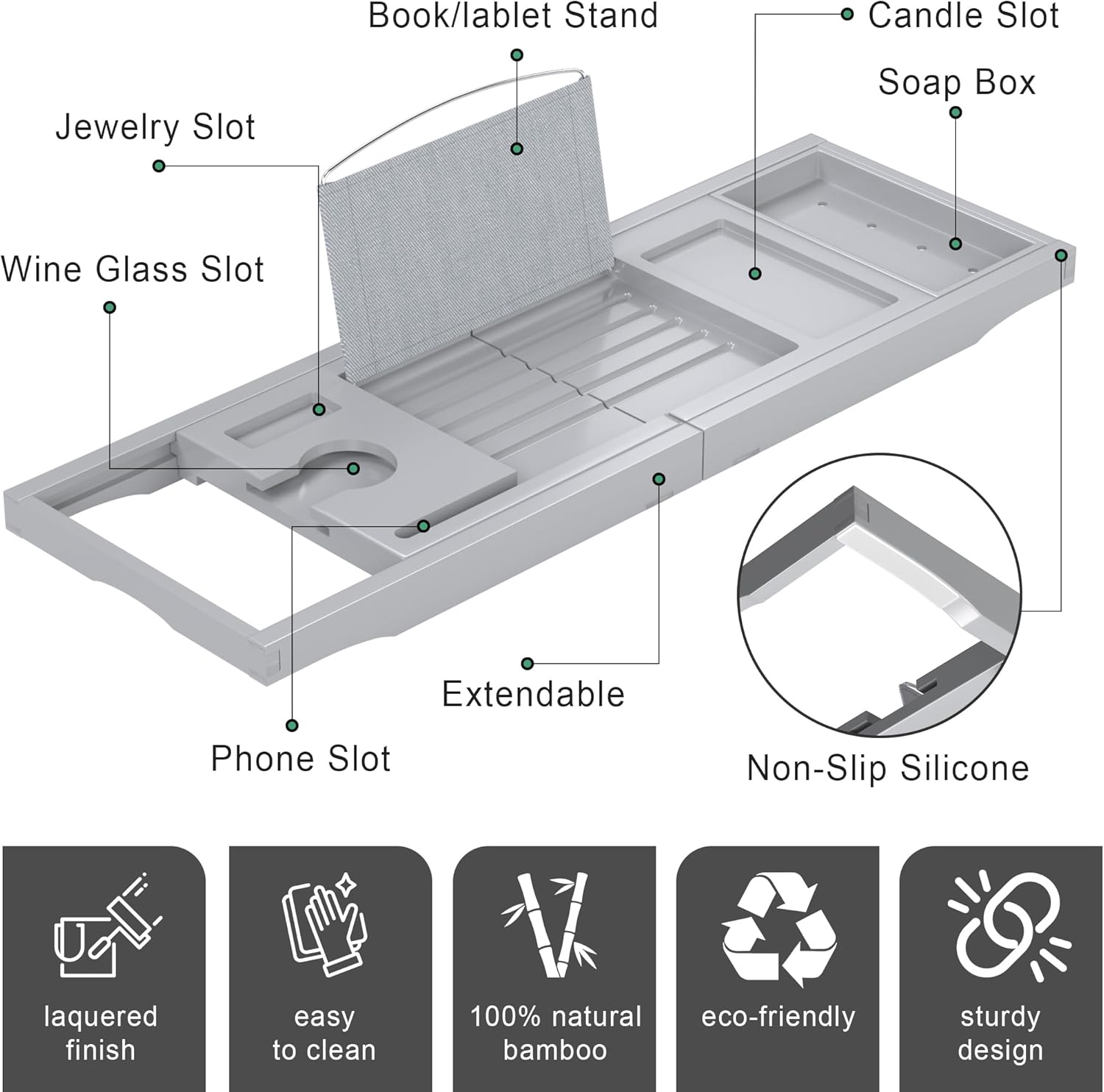 - 🛁WATER-RESISTANT,SLIP-RESISTANT: Bath caddy tray for bathtub is made of high-quality bamboo and coated with a protective layer of lacquer makes it water-resistant and sturdy.The tub trays features a non-slip silicone pad at the bottom, ensuring it remains securely in place without the risk of tipping over and spilling important personal items.