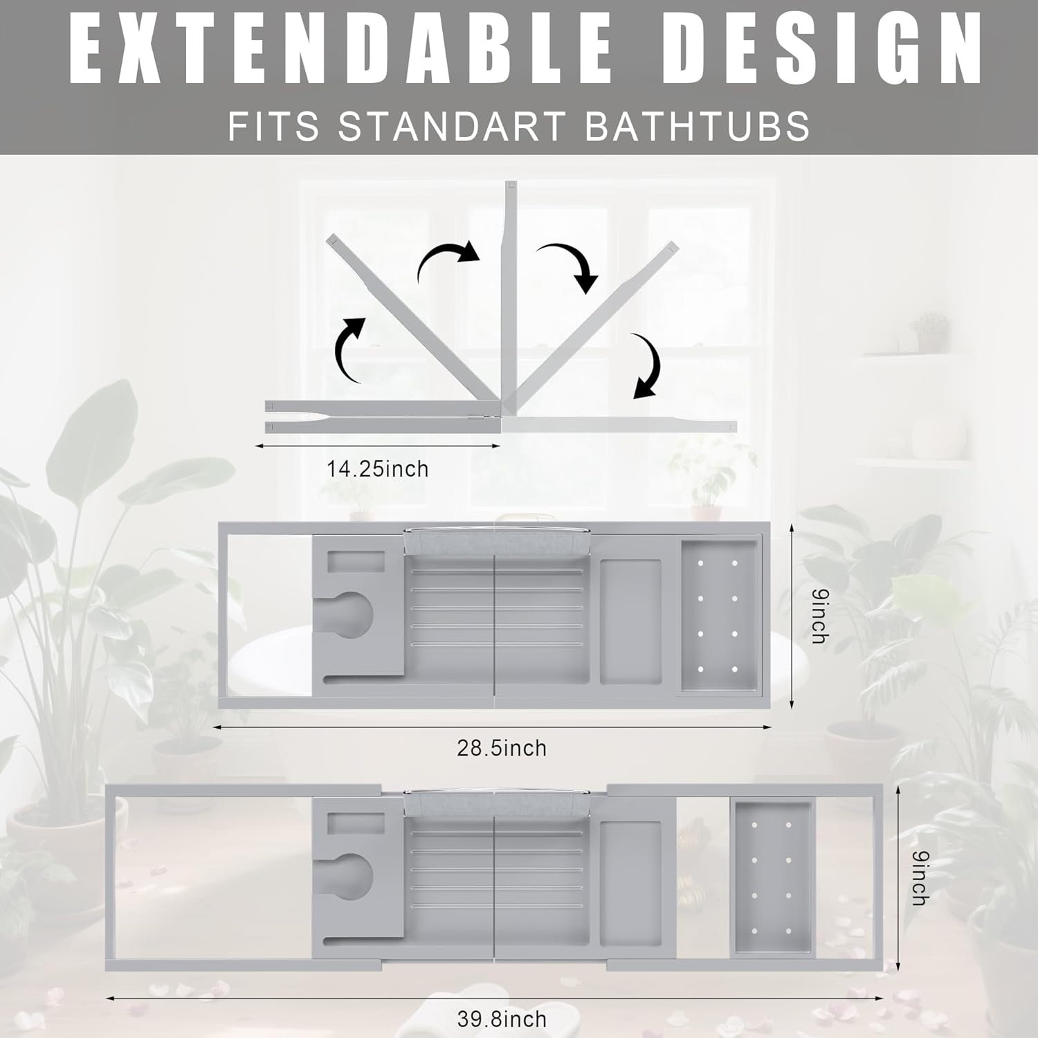 - 🛁SUITABLE FOR ALL THE BATHTUB TYPES: This bath tray table is specially designed to extend from 28.5 "to 39.8" to fit almost any size bathtub, you just need to manually adjust it to the right length without any assembly tools.