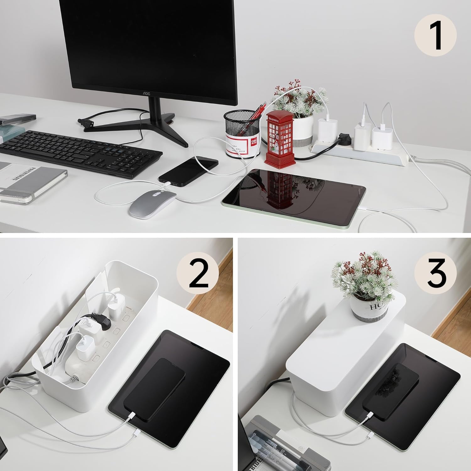 - Multi-Functional Cord Hider Box: This cord management box is designed as a multi-functional cable box organizer, specifically for managing cables, power strips, cords, chargers, and other messy accessories in homes or offices. Our cord box hider helps keep your workspace, meeting rooms, and home living areas organized and tidy, preventing clutter and improving space management efficiency.