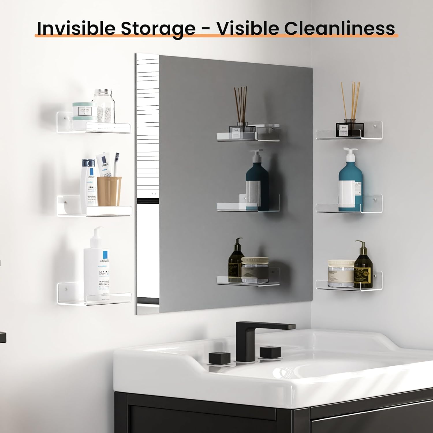 - 【SPACE SAVING & LOOK NEATER】6 pack acrylic shelves that allow you to utilize small wall space more efficiently. You can conveniently store everything while keeping your room organized. It's a great space-saving wall organizer!