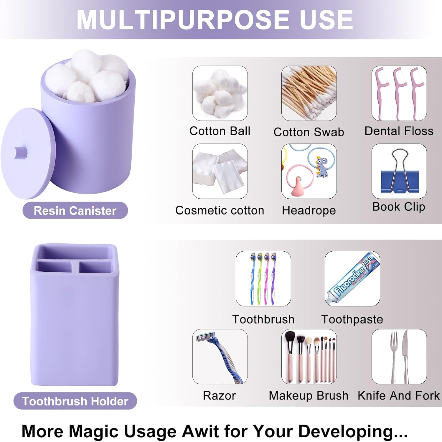 - RESIN PURPLE BATHROOM ACCESSORIES SET COMPLETE - Our bathroom set includes 1 x soap dispenser, 1 x toothbrush holder, 1 x vanity tray, 1 x bathroom tumbler, and 2 x apothecary jars. A complete set of all-in-one bathroom essentials that are easily accessible!