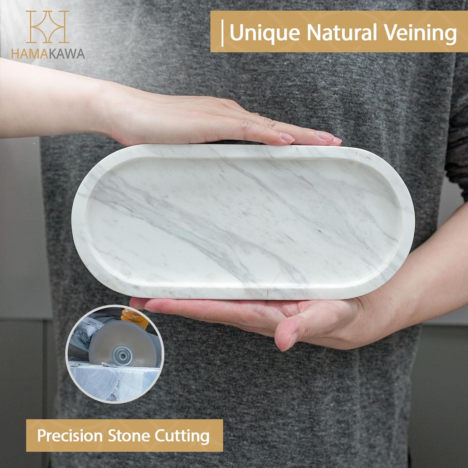 Oval Bathroom Vanity Tray, Large Natural Marble Sink Tray 10 Inch, Volakas White Stone Soap Trays, Modern Perfume Trays, Countertop Organizer for Kitchen, Coffee Table, Home Decor