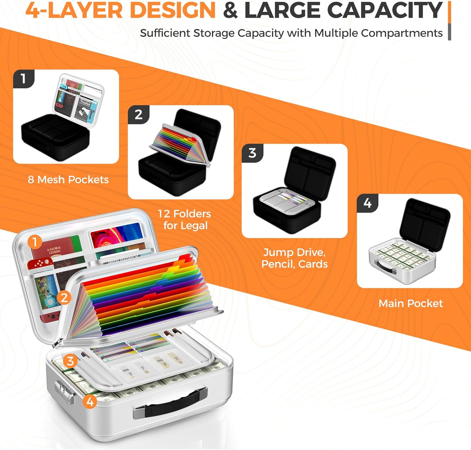 - Large Capacity & Multi-Compartment Storage: With a size of 15.8 x 11.8 x 5.4 inches, this fireproof document box provides ample space. It features 12 accordion folders, 2 main mesh pockets, 16 card slots, 2 USB pockets, and 4 pen slots