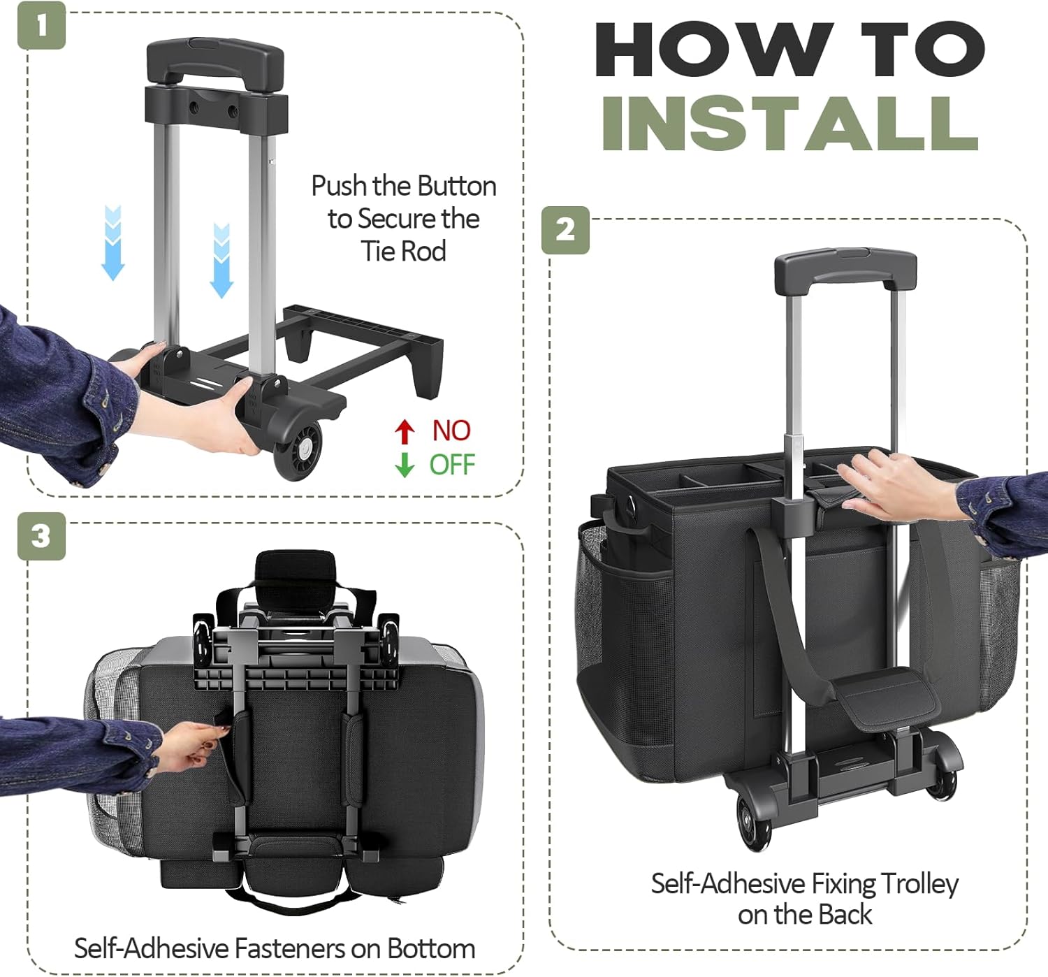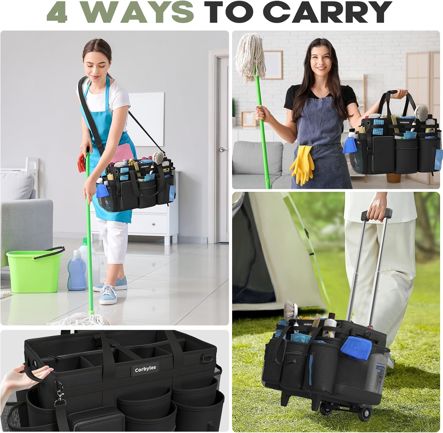 - 4 Carrying Ways: This housekeeping tote bag has 2 reinforced padded carry handles, 2 short side carry handles, 1 detachable telescopic trolley and 1 adjustable shoulder strap, multiple ways to use for various cleaning and transportation scenarios. The cleaning cart with wheels is a great companion for cleaning professionals who need to work on the go and make your cleaning work easier.